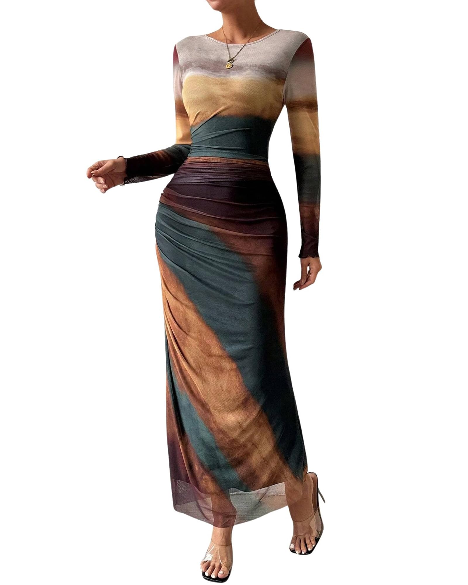 MOEENCN Women Sheer Mesh Maxi Dress Long Sleeve Bodycon Birthday Outfits Ruched Tie Dye Cocktail Club Party Dresses|Clothing