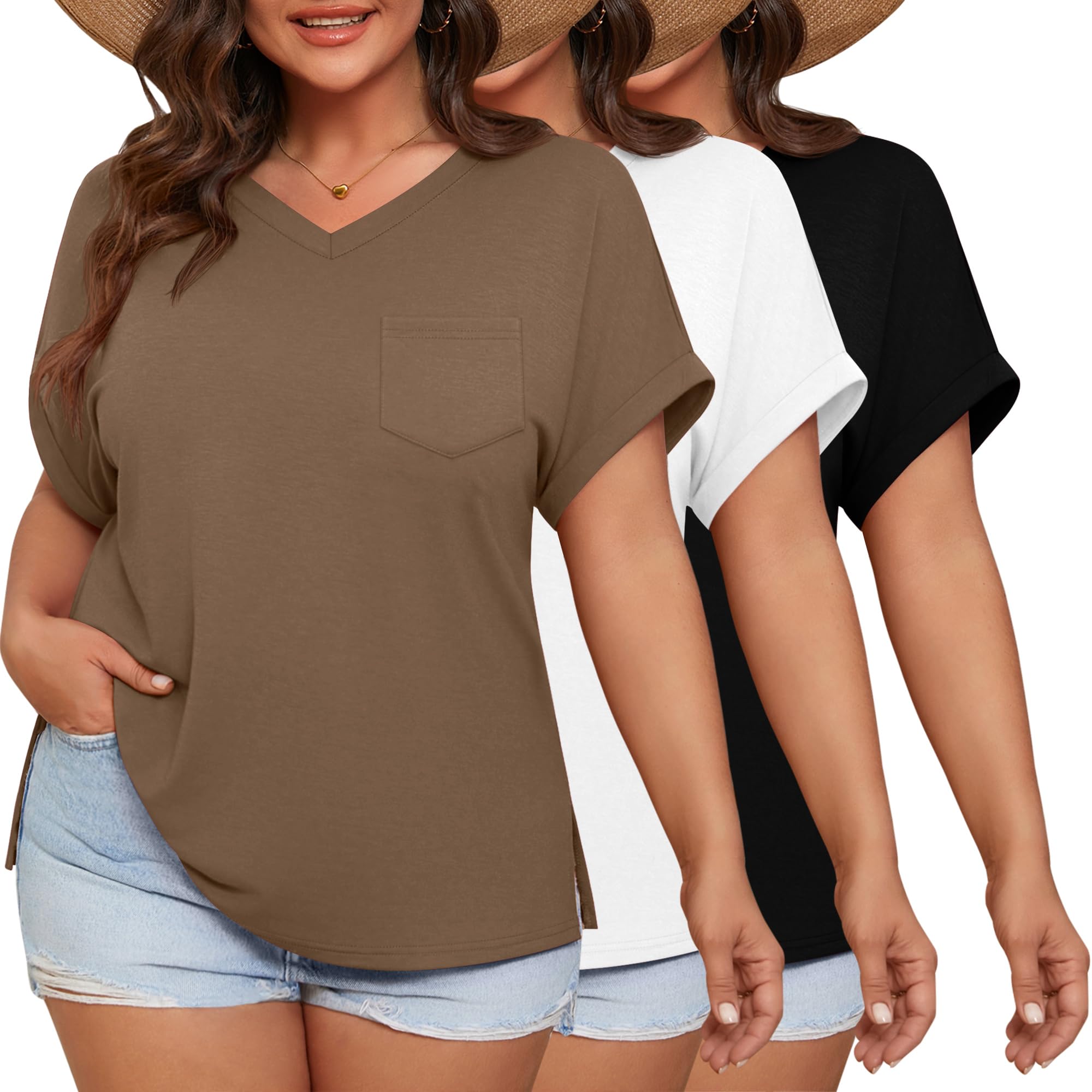Ficerd 3 Pack Women's Plus Size T-Shirts, V Neck Short Sleeve Oversize Tunics Tops Sides Split Summer Loose Tees with Pockets|Clothing