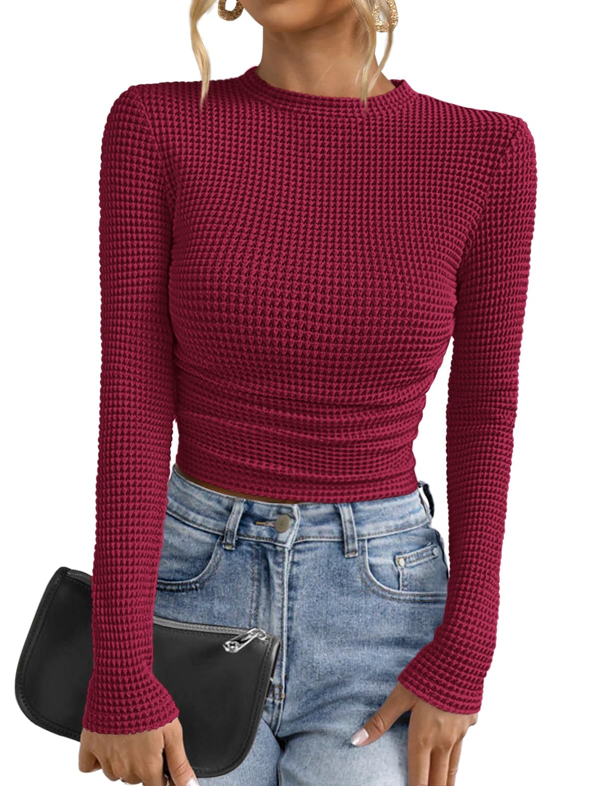 PRETTYGARDEN Womens Tops 2026 Spring Long Sleeve Fitted T Shirts Waffle Ruched Crop Shirt Basic Knit Workout Y2k Clothes|Clothing
