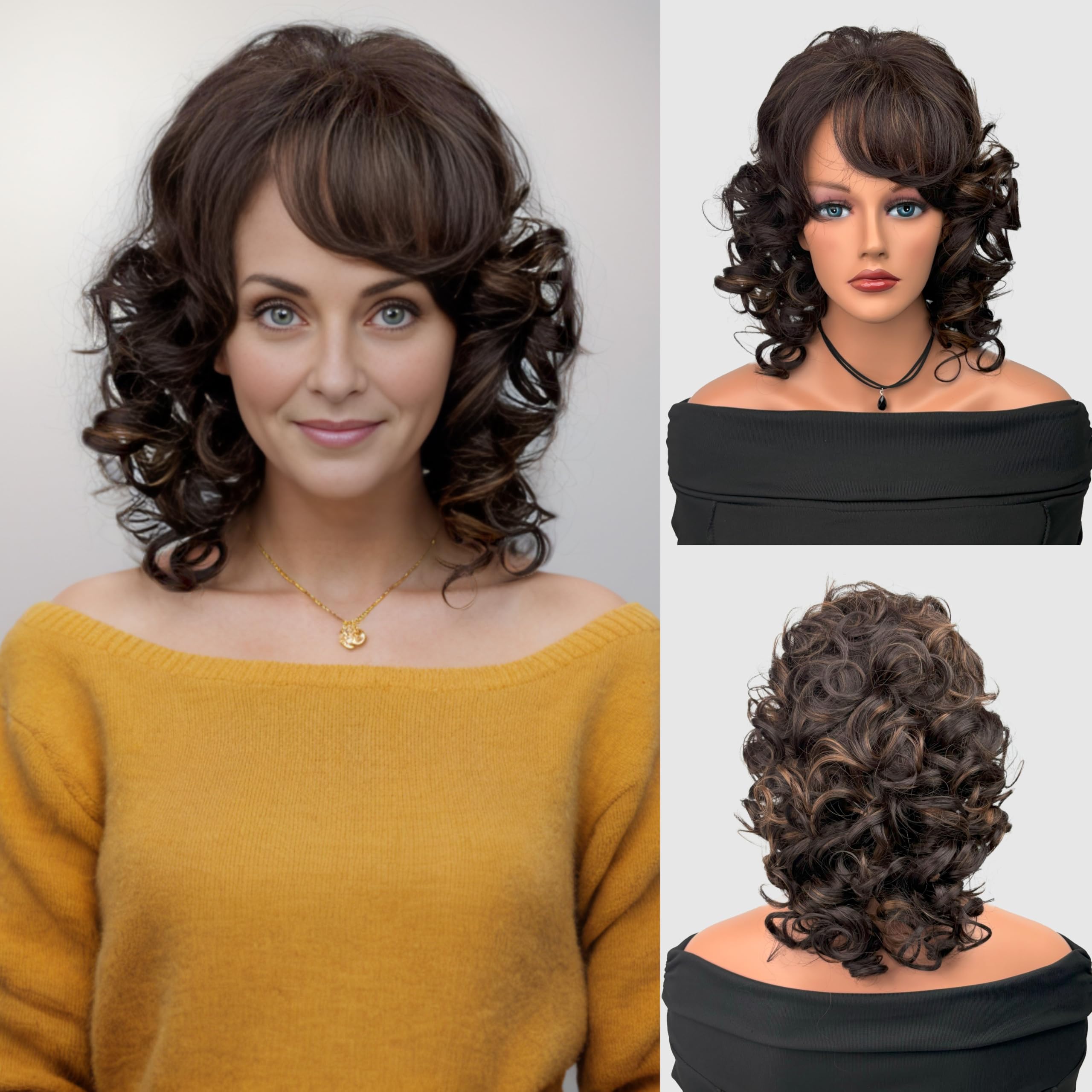 ZadaBelly Short Shoulder Length Brown Curly wavy Wig for Women 70s 80s Ladies Wig with Bang Heat Resistant Synthetic Hair Water Wave fits Retro|Health & Beauty