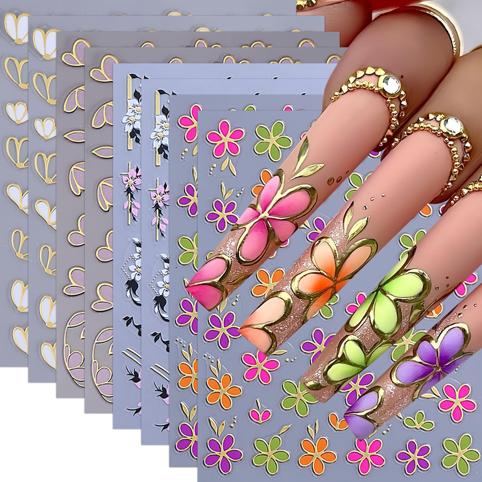8 Sheets Flower Leaf Nail Art Stickers Elegant Nail Decals Floral Nail Sticker Gold Silver Petal Leaves Flower Nail Decals Colorful Floral Nail|Health & Beauty