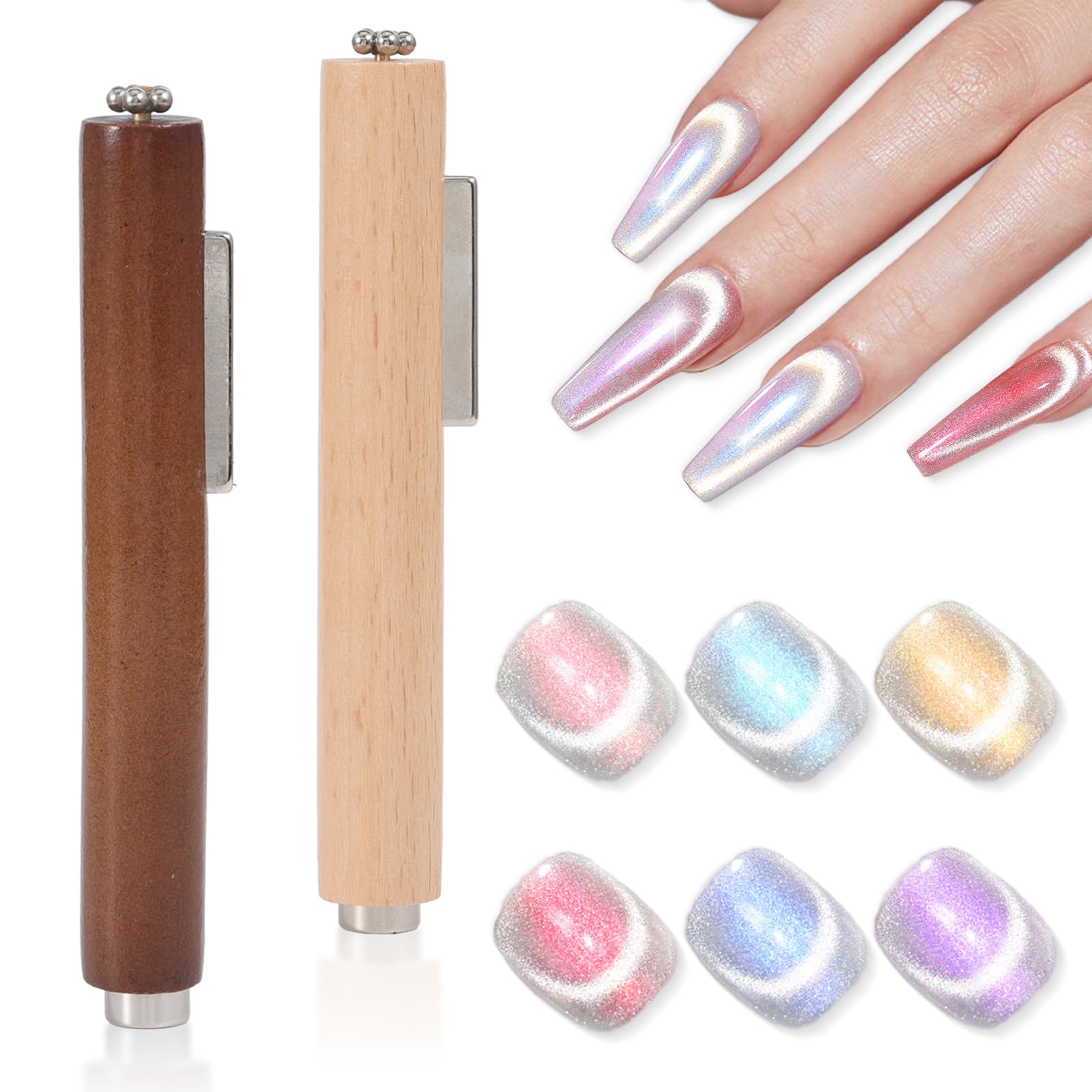 JERCLITY 2 Pieces Wooden Handle Cat Eye Magnet for Nails 3 in 1 Cylindrical Nail Art Magnet Brown and Wood Color Powerful Multifunctional Nail Art|Health & Beauty