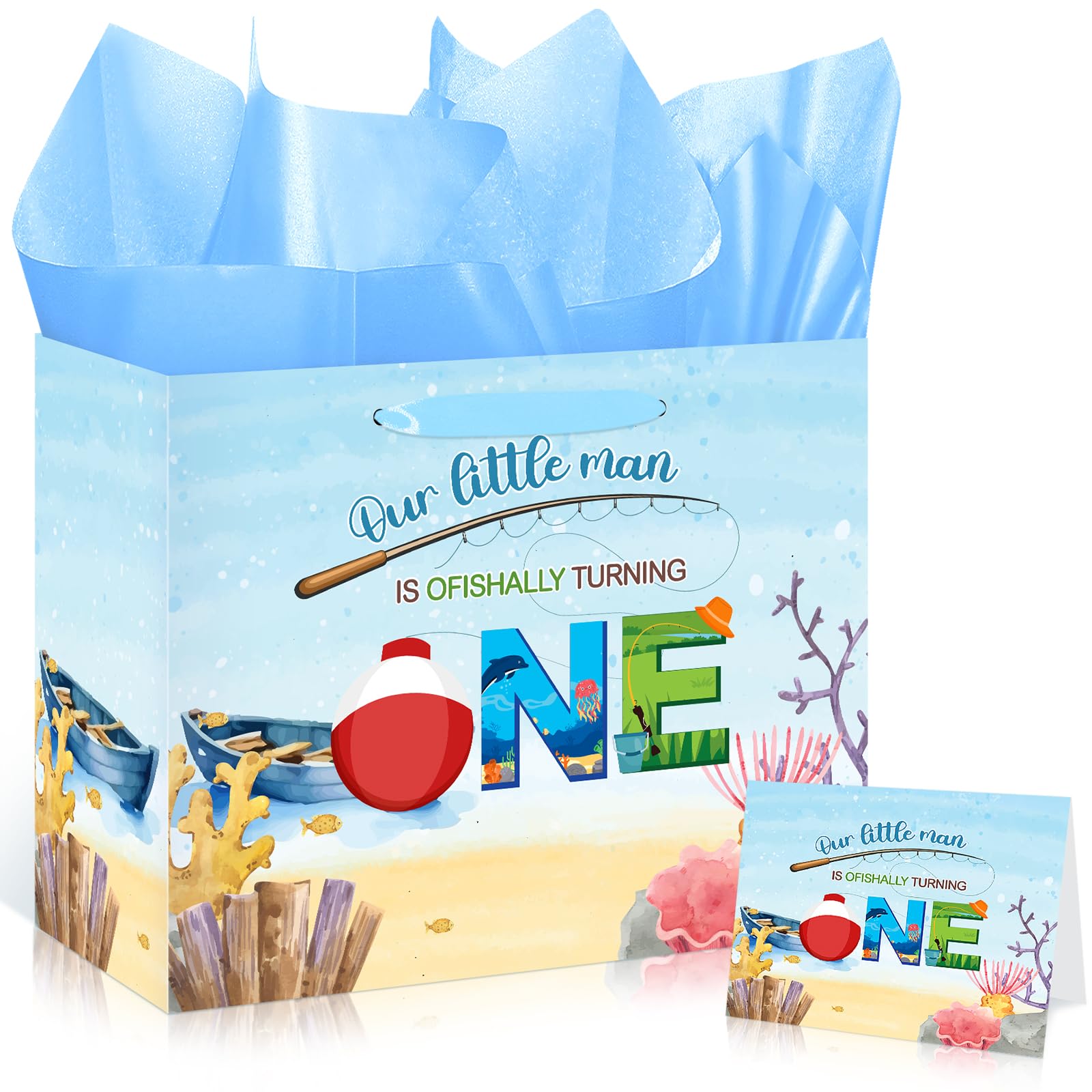 LUUFILx Fishing 1st Birthday Gift Bag Blue Gone Fishing One Birthday Decorations for Boys with Tissue Paper and Card Wrapping Bag with Handle for Baby|Health & Beauty