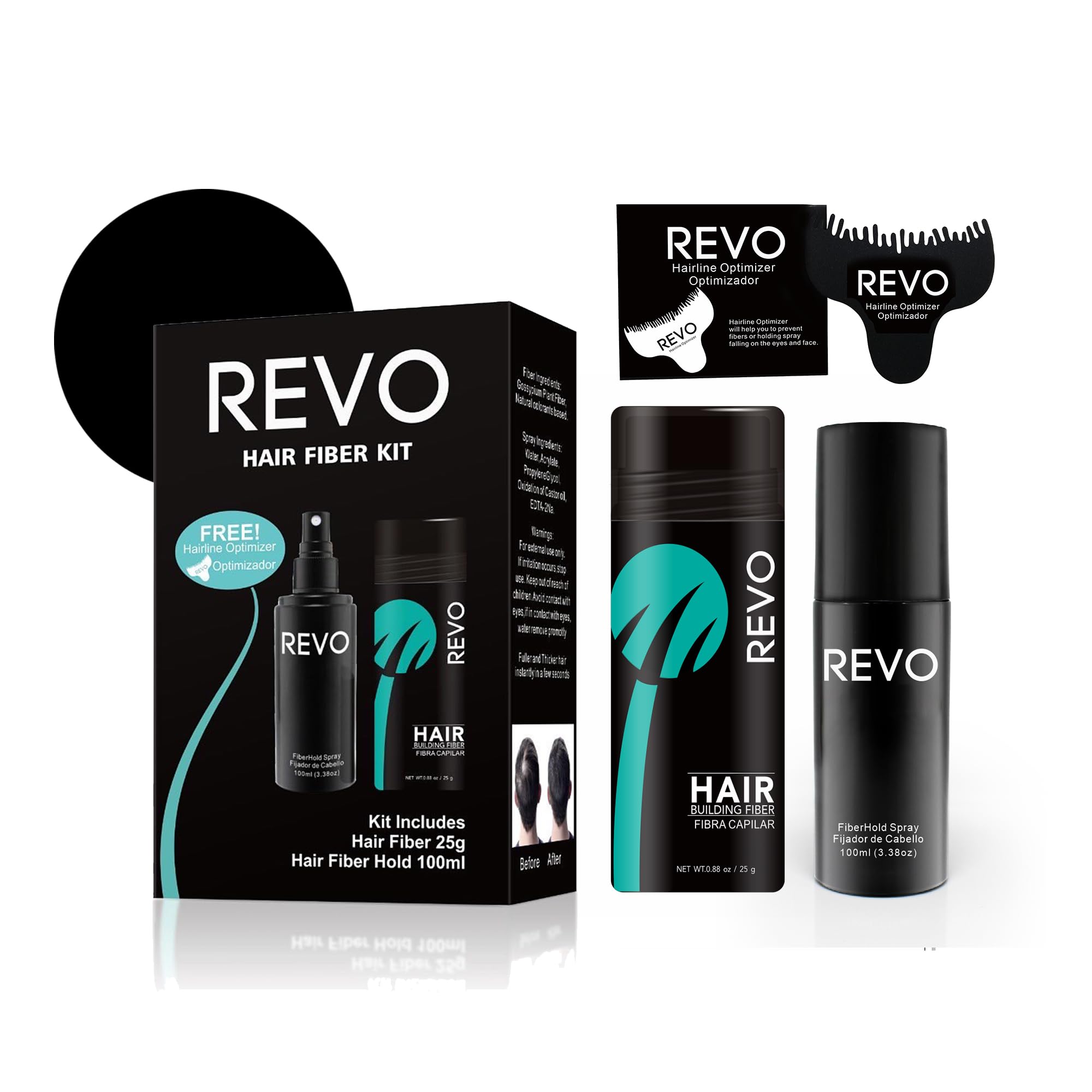 REVO Hair Building Fibers Complete Kit Black – Includes 25g Hair Fibers, 100ml Fiberhold Spray & Hairline Optimizer – Instantly Conceals Bald Spots &|Health & Beauty
