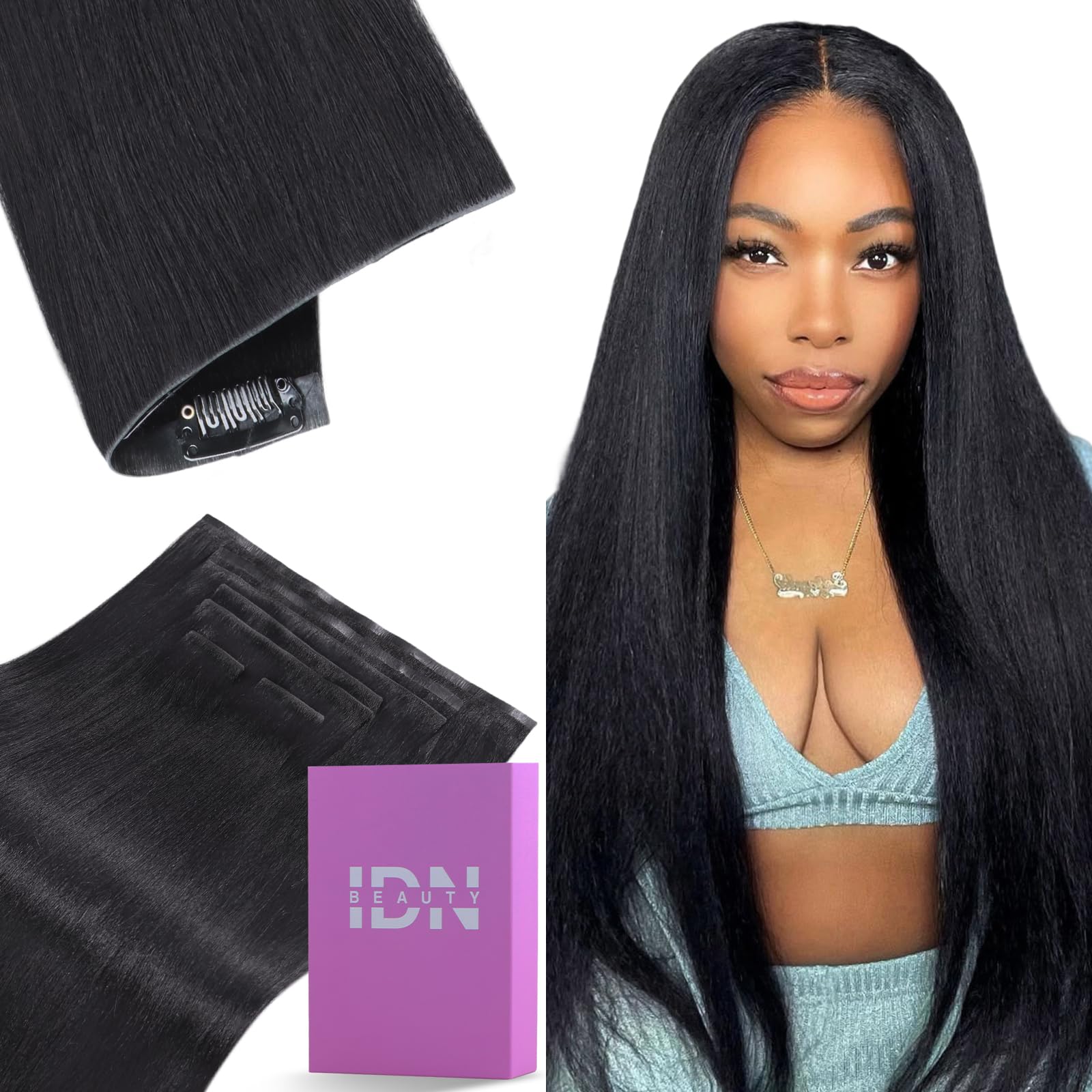 IDN BEAUTY 5+2 Invisi Edge Seamless Clip in Hair Extensions Human Hair Combo Pack, Yaki Straight 14 Inch 110g 5pcs Invisible Edge and 2pcs Seamless|Health & Beauty