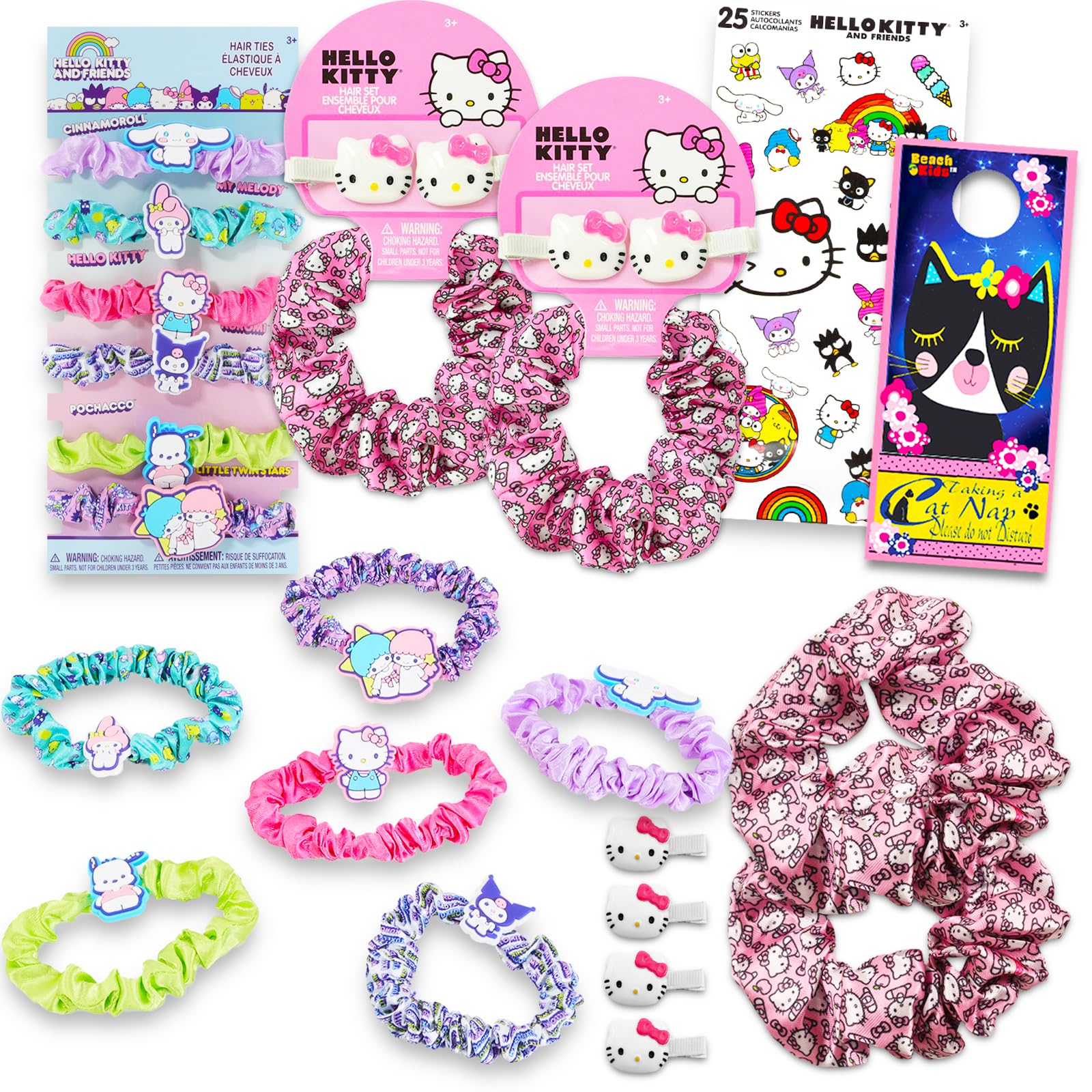Hello Kitty Scrunchie Set - My Melody, Kuromi and Cinnamoroll Bundle with 8 Scrunchies, 4 Hair Clips, Stickers, More | Hello Kitty Hair Ties for Girls|Health & Beauty