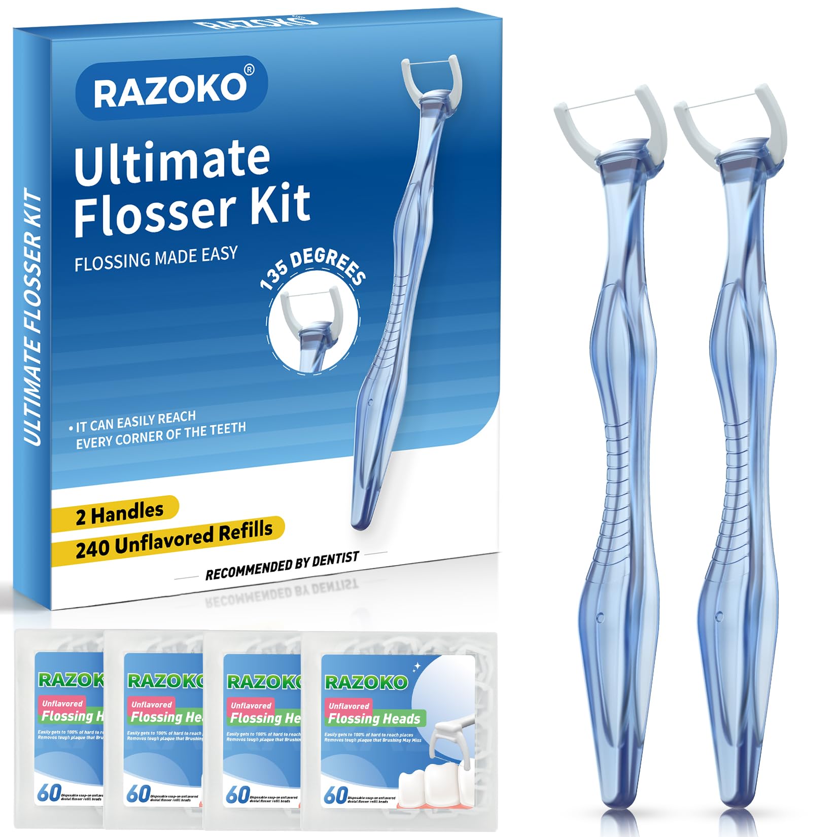 RAZOKO Dental Flosser Kit, Extra Strong Shred-Resistant Floss, 135 Degrees for Hard-to-Reach Areas, PTFE & PFAS Free, 2 Handles + 240 Refill Heads|Health & Beauty
