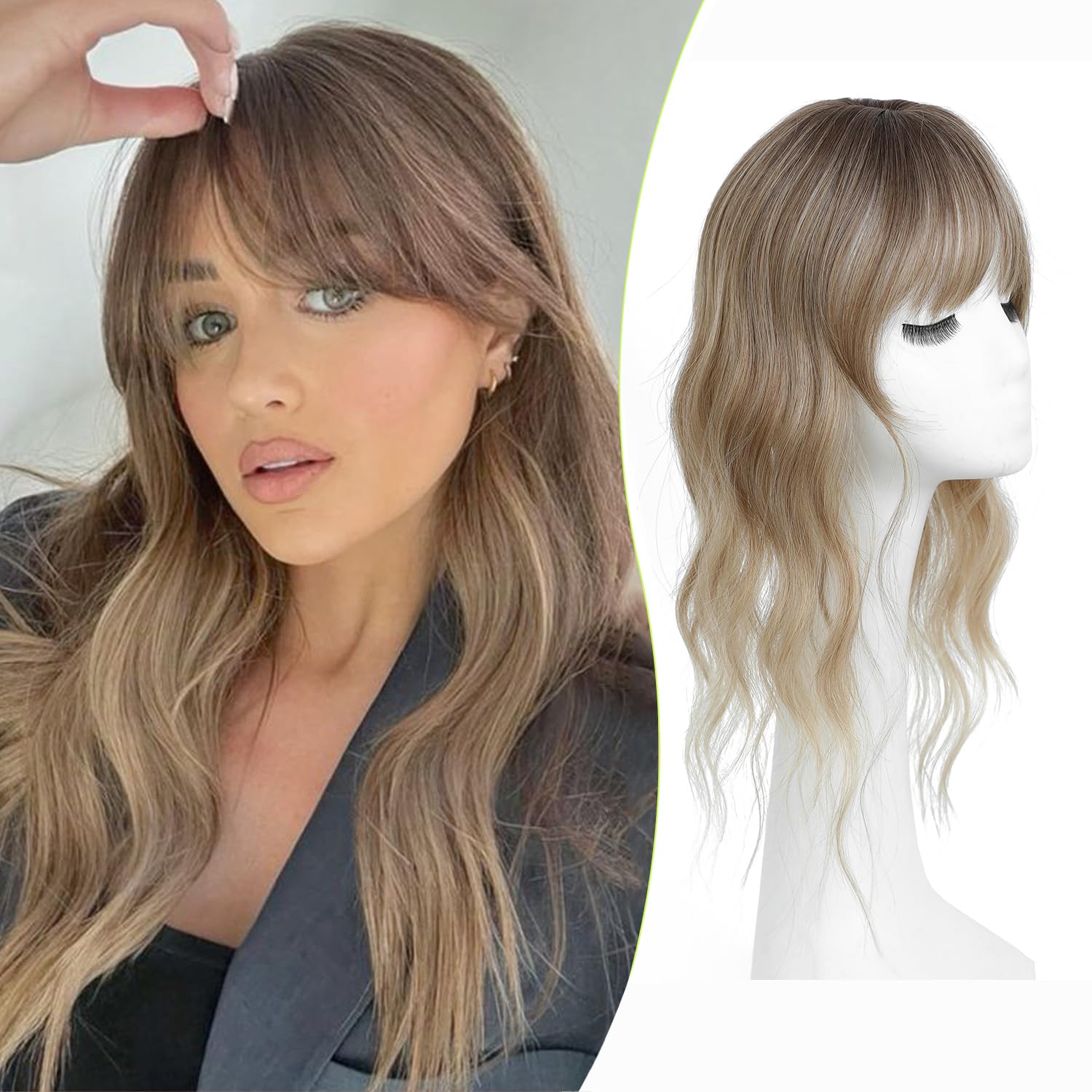 PANEWAY Ombre Dark Blonde Wavy Hair Topper with Bangs, 2.5''x2'' Base, 150% Density, Heat Resistant, Synthetic, 18 Inch, Modern Style, For Women with|Health & Beauty