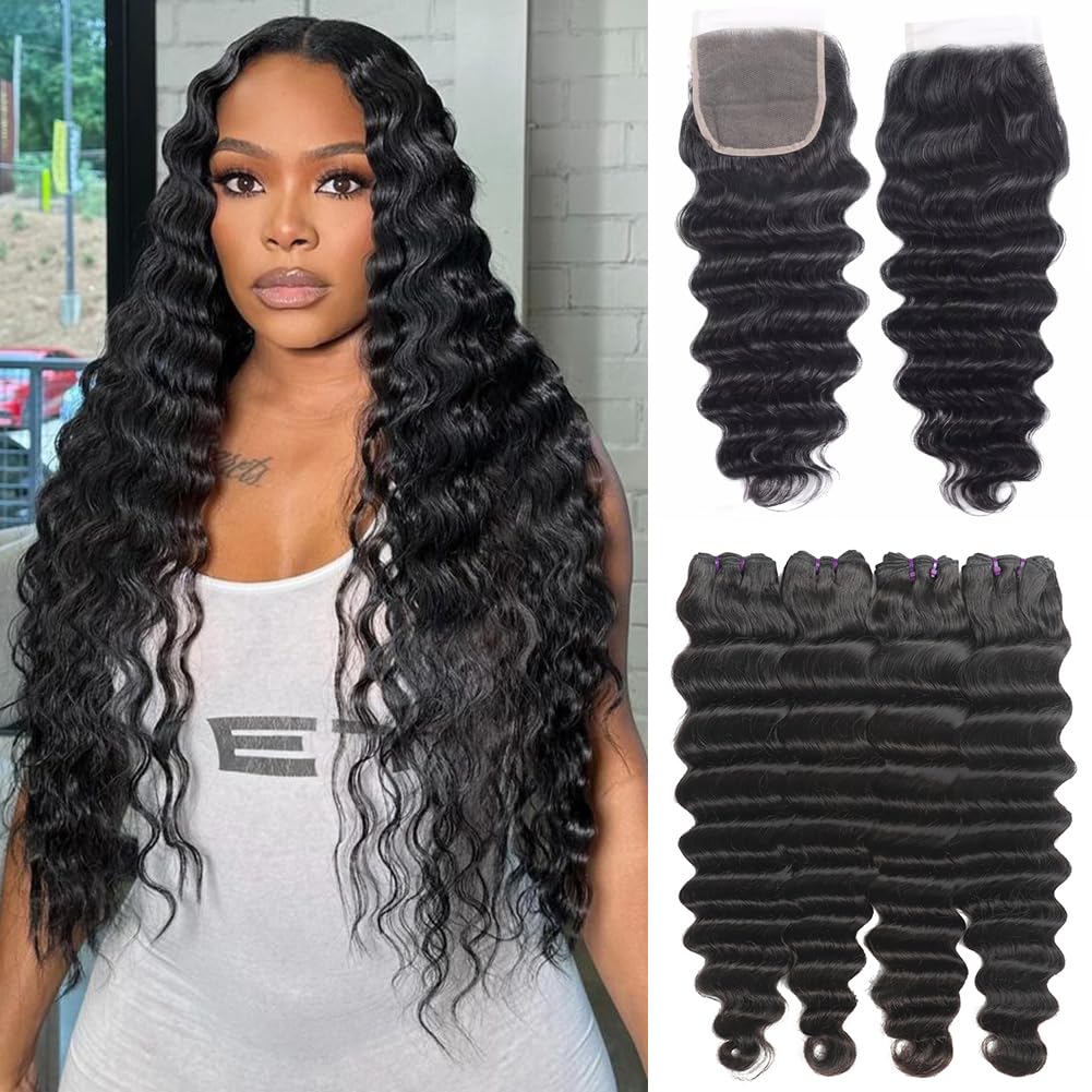 Human Hair Bundles with Closure (22 24 26+20,Free Part) Deep Wave Bundles with Lace Closure Brazilian Human Hair Weave Bundles with Closure Virgin|Health & Beauty