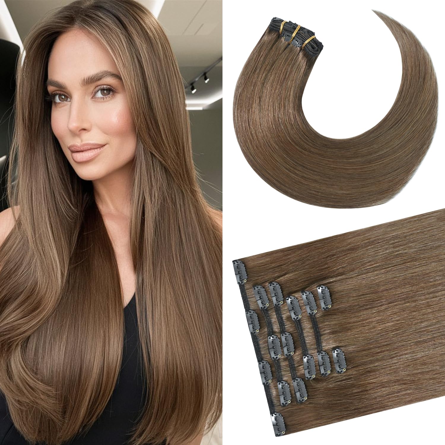 Lacer Clip-in Hair Extensions, 20 Inch Light Dark Brown, Double Weft Straight Natural, Real Human Hair, 120g, 7pcs, 18 Inch for Women|Health & Beauty