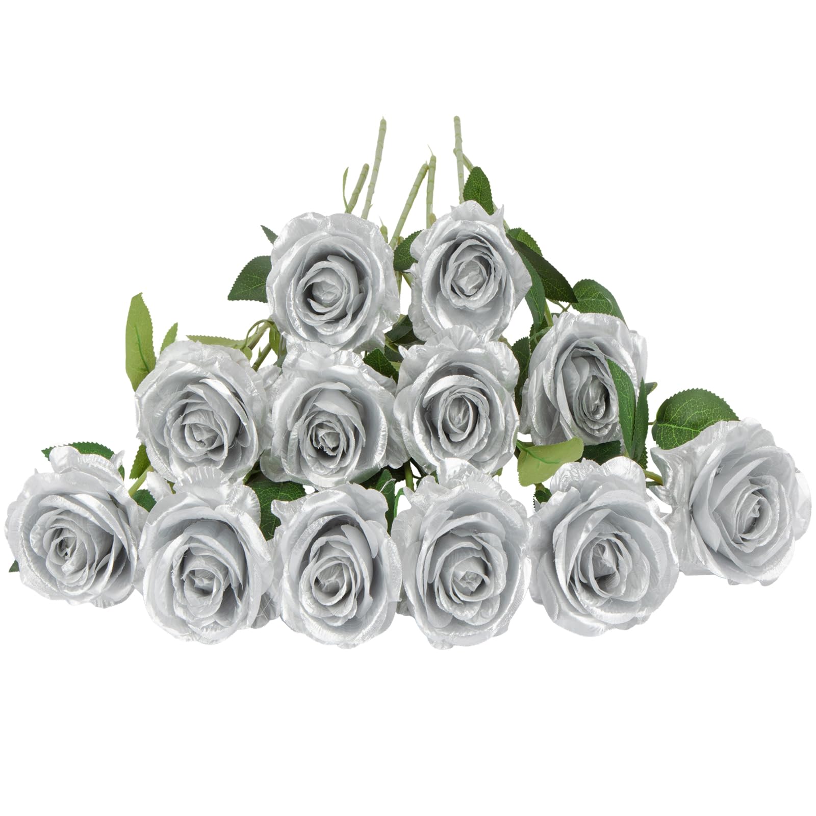 12 PCS Artificial Flowers Silver Roses, Silk Flowers Fake Long Stem Artificial Roses for Home Wedding Bathroom Kitchen Decorations (Silver)|Home & Garden