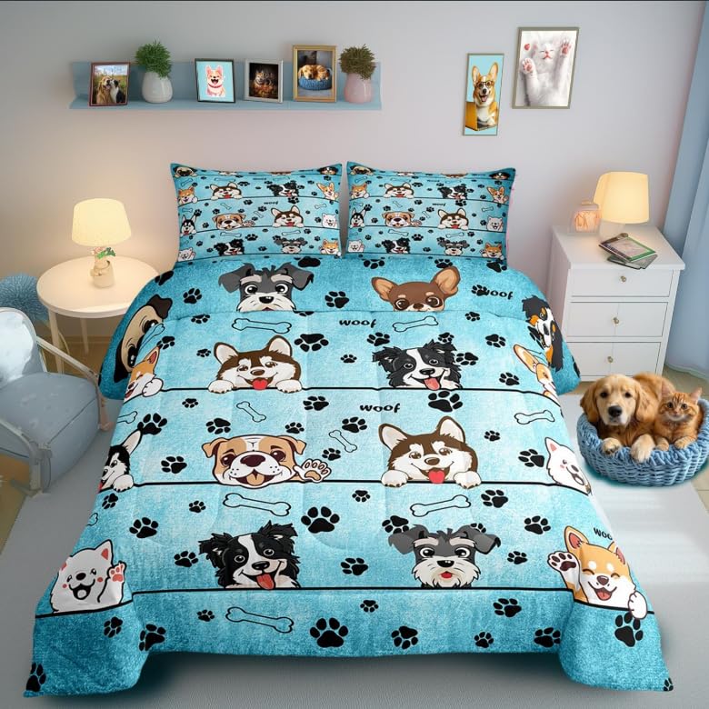 Manfei Cute Dog Comforter Set for Kids Room Decor Cartoon Puppy Pet Animals Bedding Comforter Full Size Black Paw Print Blue Soft Polyester Quilt Set|Home & Garden