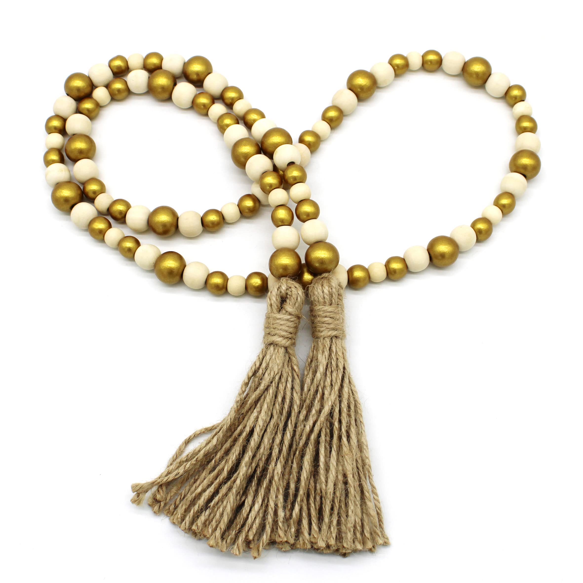 CVHOMEDECO. Wood Beads Garland with Tassels Farmhouse Rustic Wooden Prayer Bead String Wall Hanging Accent for Home Festival Decor. Gold Mix|Home & Garden