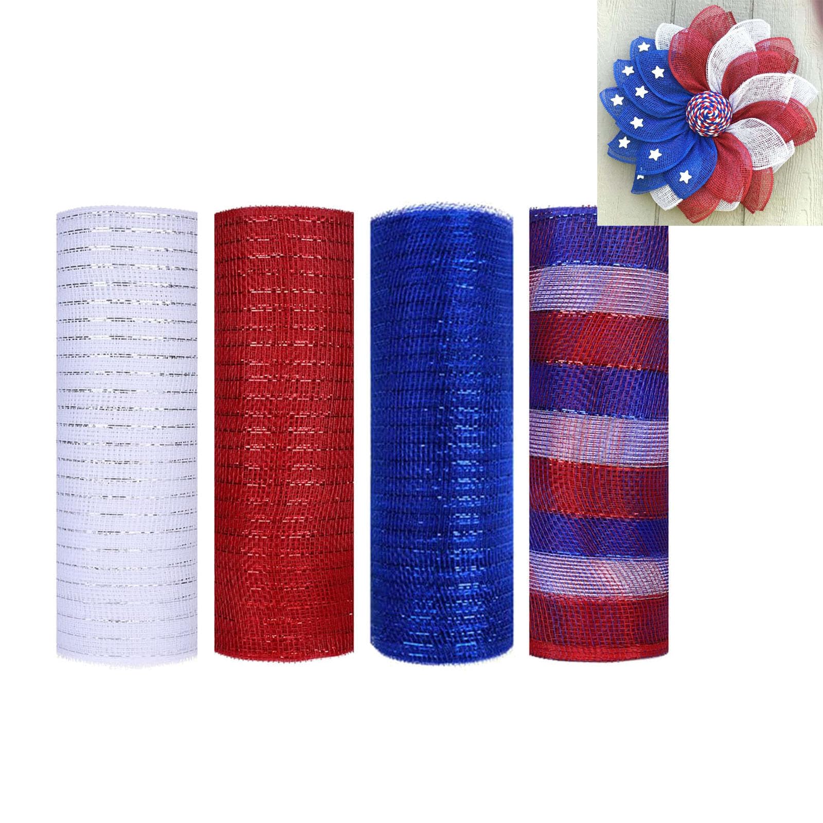 JStnana 4 Rolls 4th of July Deco Mesh for Wreath Making 10 Inch x 30 Feet Each Roll Metallic Foil Poly Mesh Ribbons Red Blue White Deco Mesh Crafts|Home & Garden