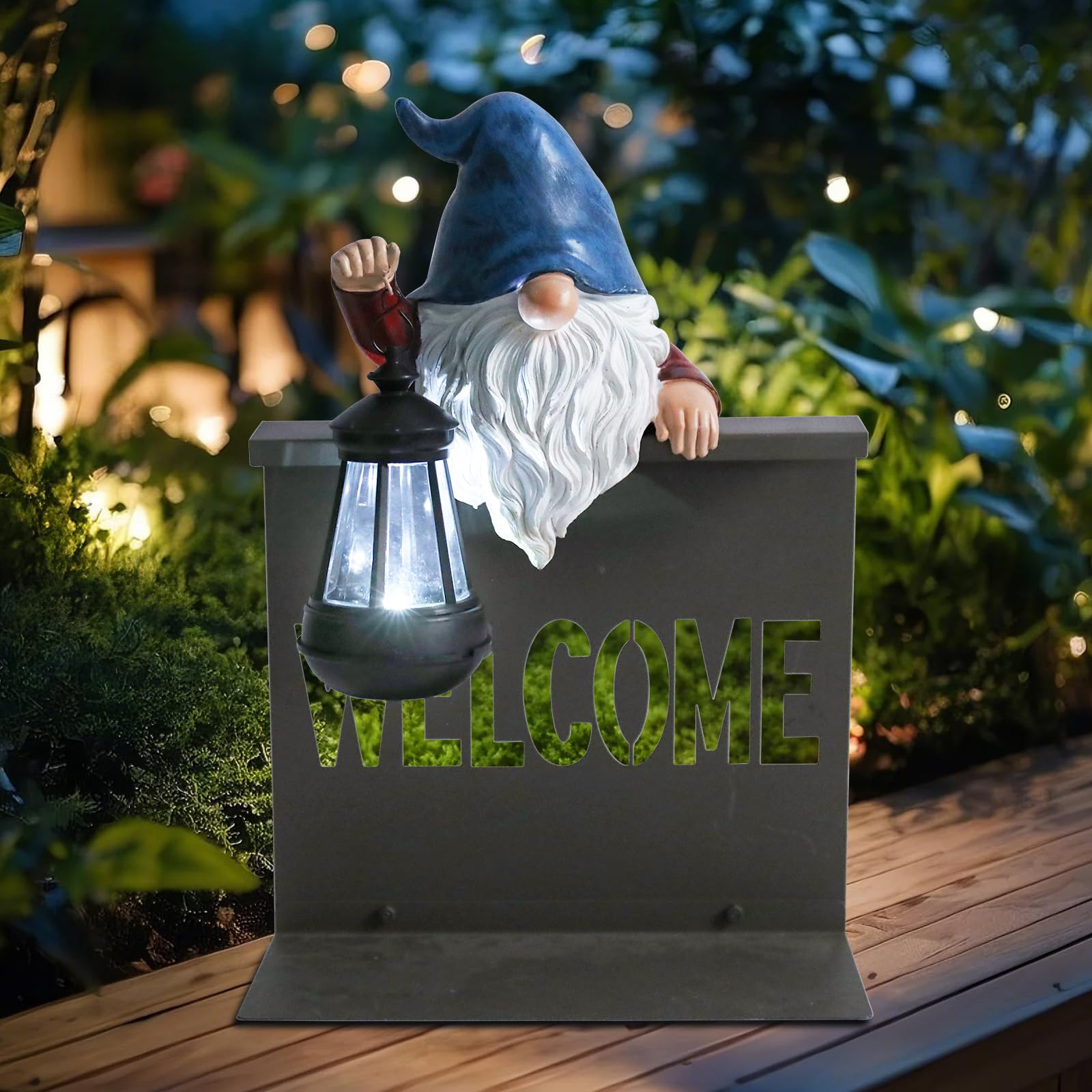 Garden Gnome Statues Outdoor Decor, Solar Gnome Sculpture Holding Lanterns Garden Gnomes Outdoor Decorations with Welcome Fence Base for Patio, Lawn,|Home & Garden