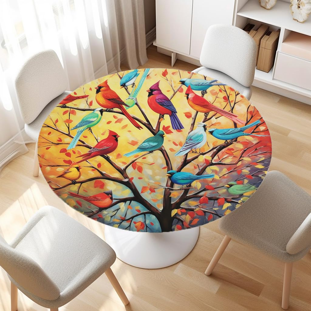 Round Fitted Tablecloth Spring Round Elastic Tablecloth Colorful Tree Cardinal Bird 45" - 56" Fitted Table Cloth Waterproof Wipeable Circular Table|Home & Garden