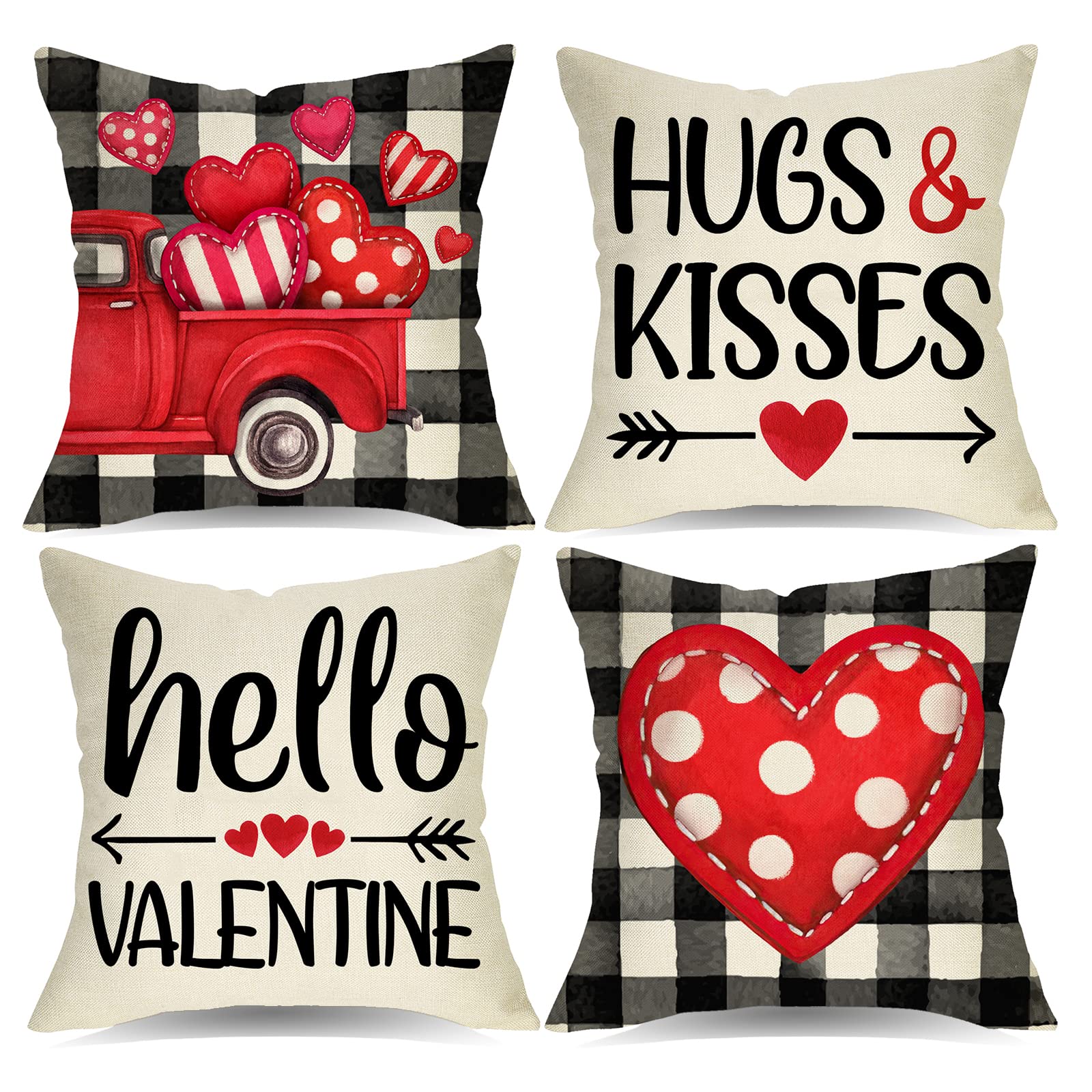 Ussap Valentine's Day Hugs Kisses Decorative Throw Pillow Covers 18 x 18 Set of 4, Holiday Red Heart Arrow Buffalo Plaid Farmhouse Cushion Case Decor,|Home & Garden
