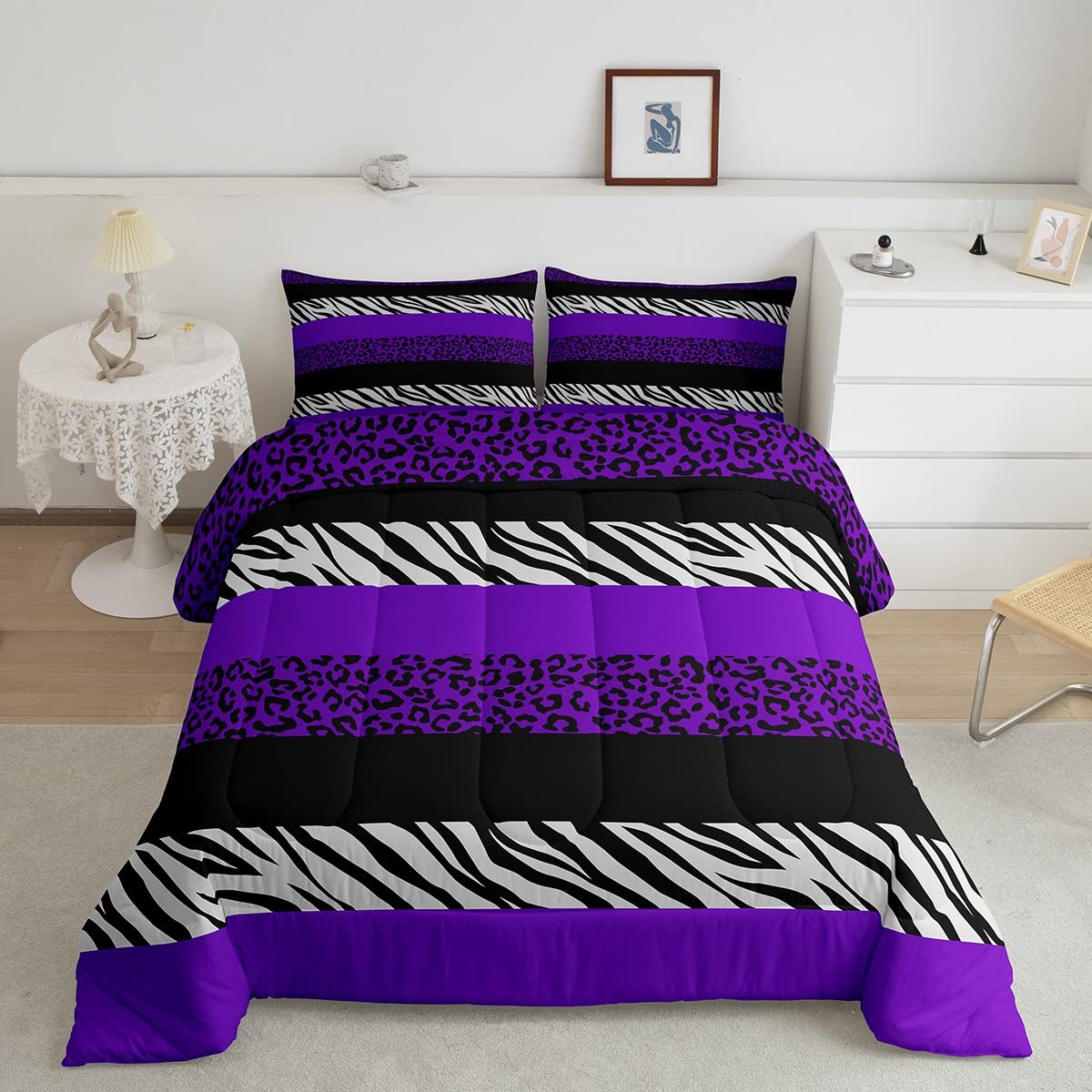 Purple Leopard Print Kids Comforter Set King Size,Zebra Abstract Animals Skin Bedding Set,Girls Boys Adults Room Decor,Geometric Stripes Down|Home & Garden