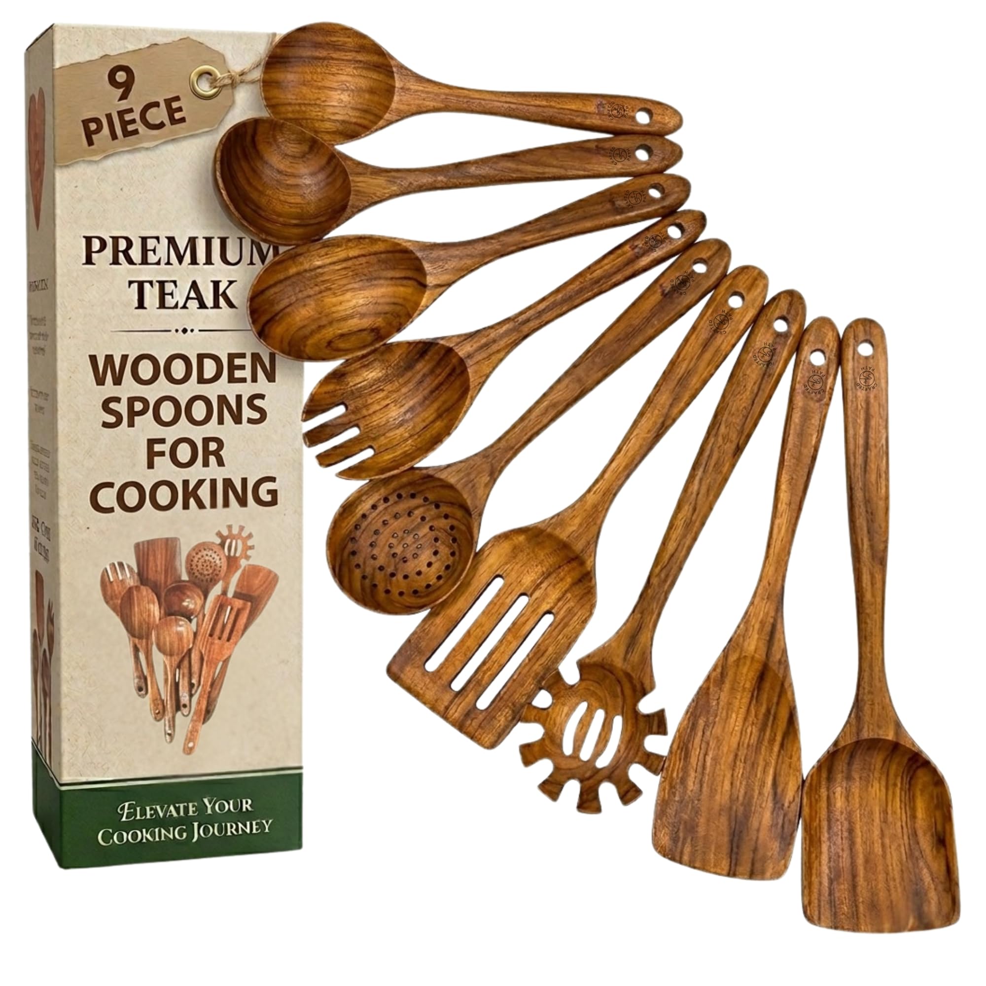 Teak Wooden Utensil Set (9-Piece) – Teak Cooking Utensils for Nonstick Cookware, Teak Wooden Spoons for Cooking & Spatula - Natural Wood Kitchen|Kitchen & Dining