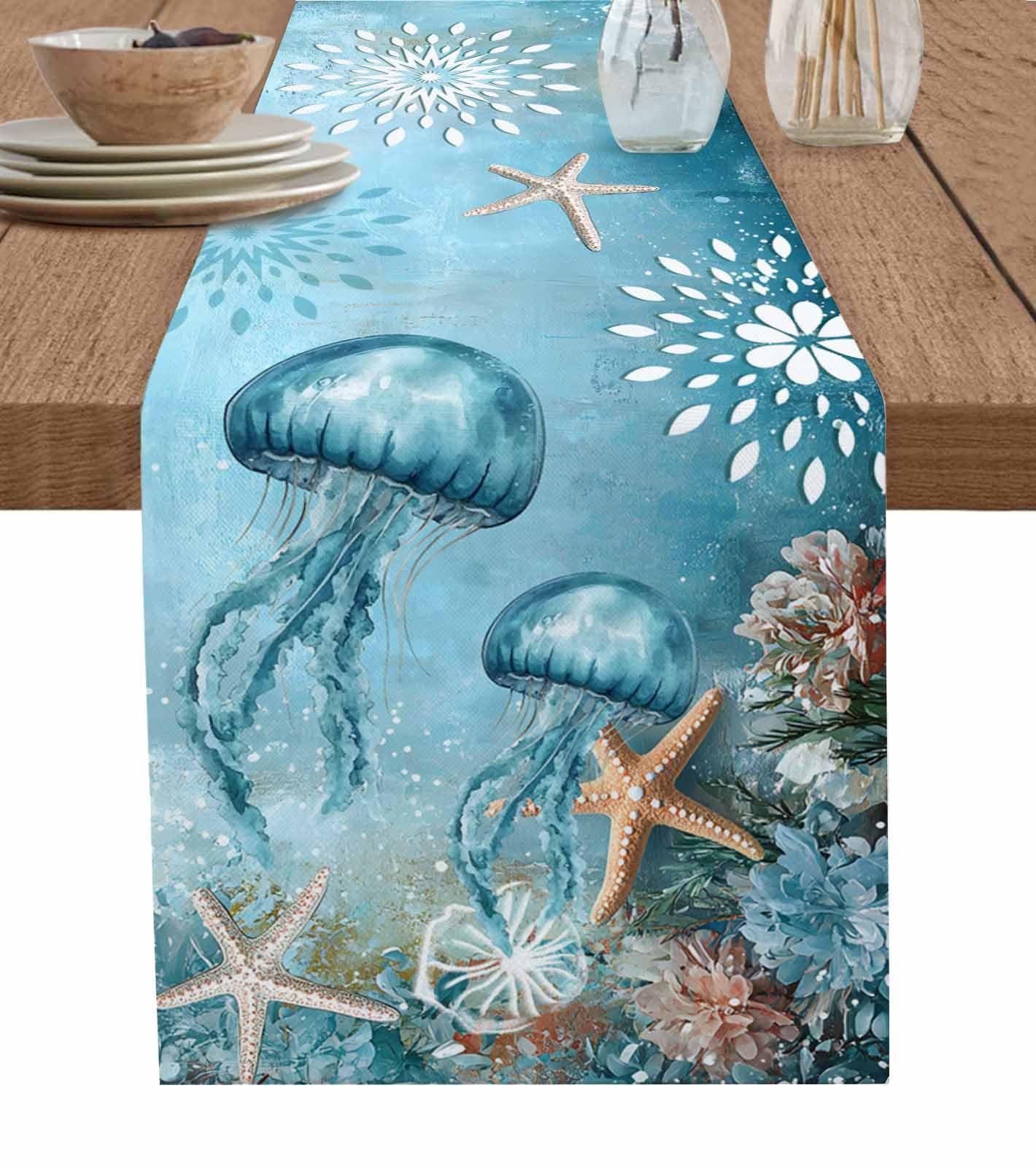 Lsrtoss Jellyfish Coastal Table Runner 108 Inches Long, Blue Nautical Starfish Farmhouse Dress Scarves, Vintage Ocean Floral Dining Tablerunner for|Kitchen & Dining