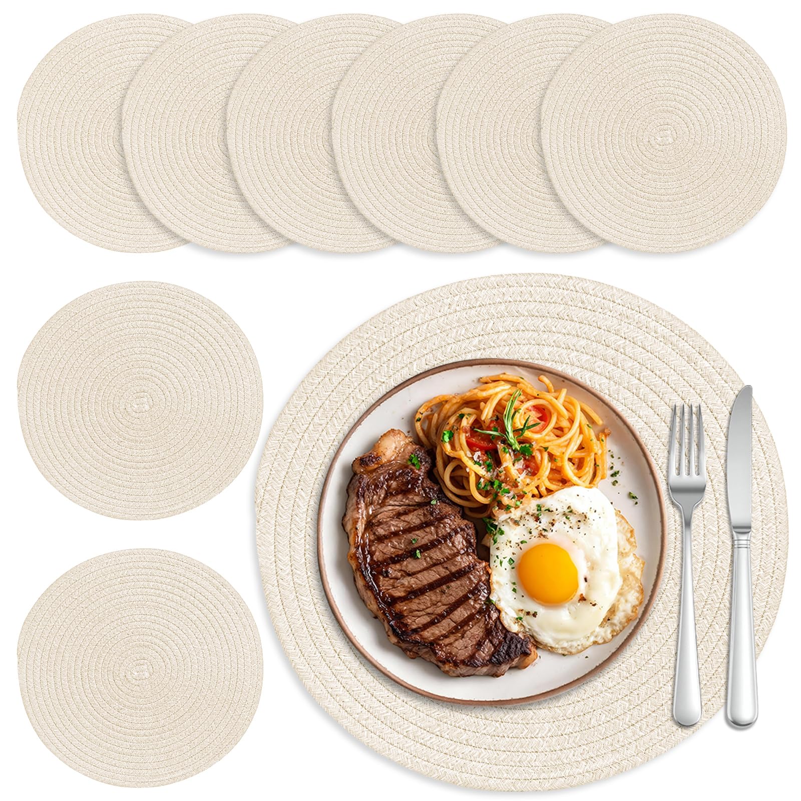 Round Woven Placemats Set of 8 Heat Resistant Placemats 13.5 Inches Farmhouse Cotton Rope Place Mats for Dining Tables Trivets for Hot Dishes, Cream|Kitchen & Dining