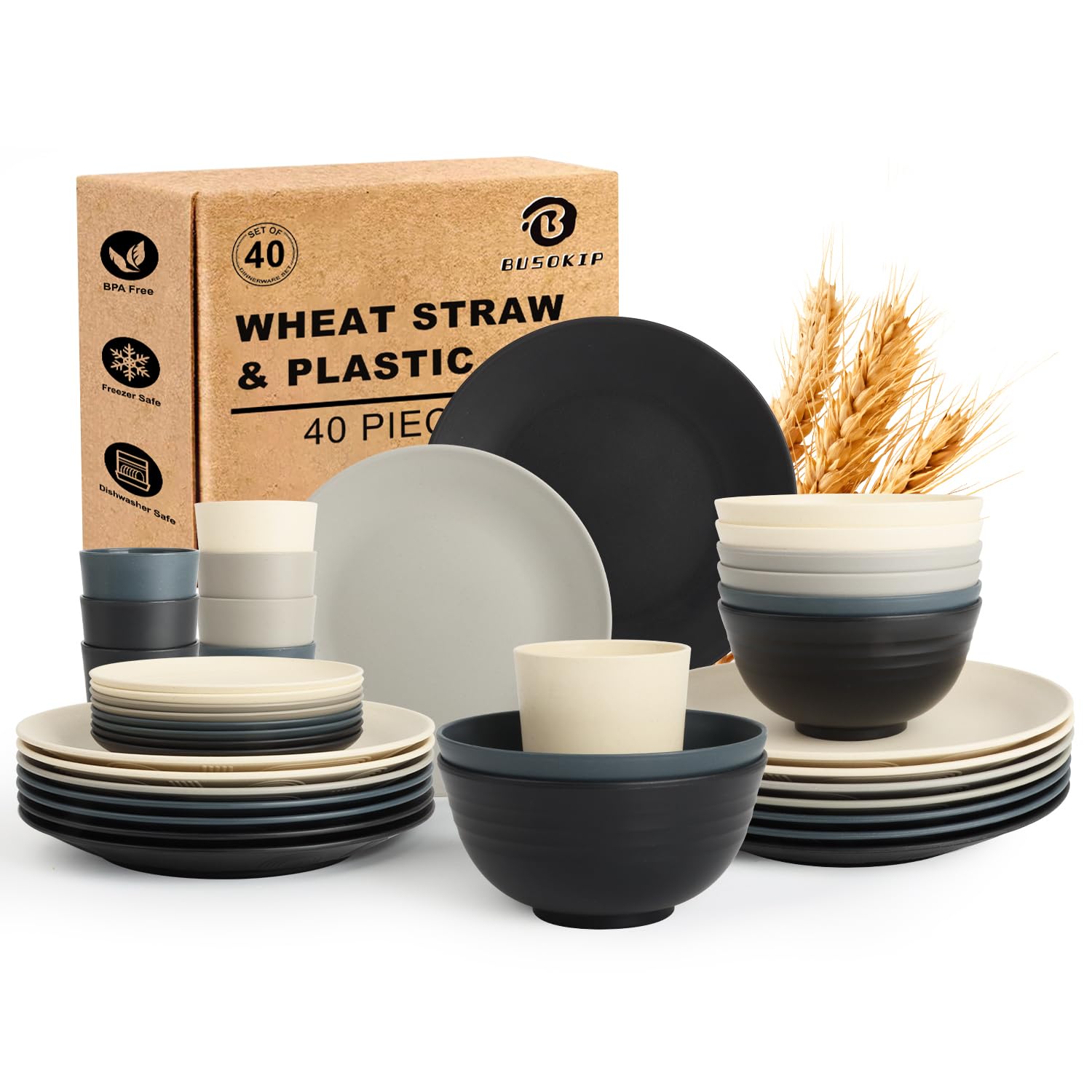 BUSOKIP 40 PCS Wheat Straw Dinnerware Set | Unbreakable Dishes Set for 8 - Alternative to Plastic Plates and Bowls Sets, Cereal Bowl, Water Cups,|Kitchen & Dining