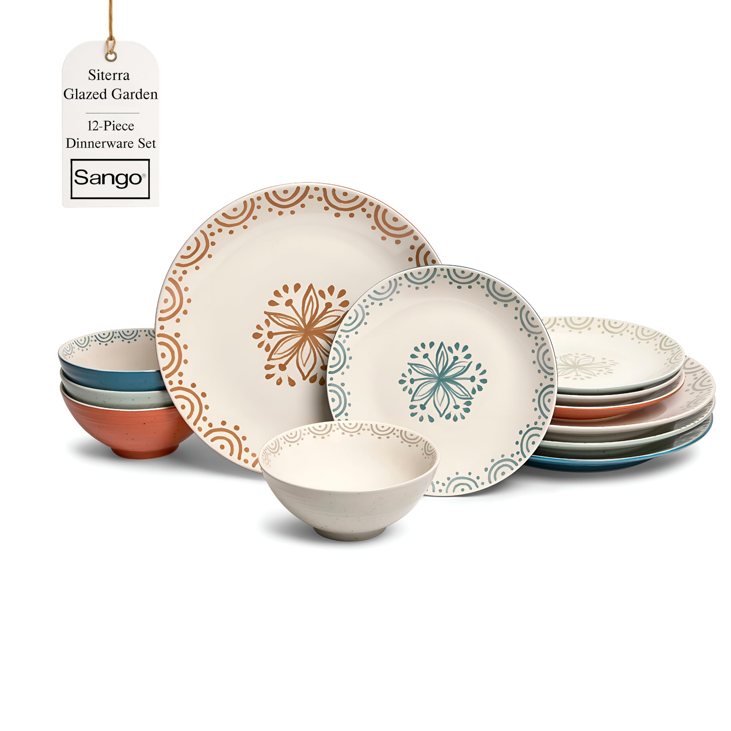 Sango 12-Piece Speckled Stoneware Dinnerware Set for 4- Glossy Plates and Bowls Set with Hand-Painted Floral Pattern, Rustic Ceramic Dish Set, Elegant|Kitchen & Dining