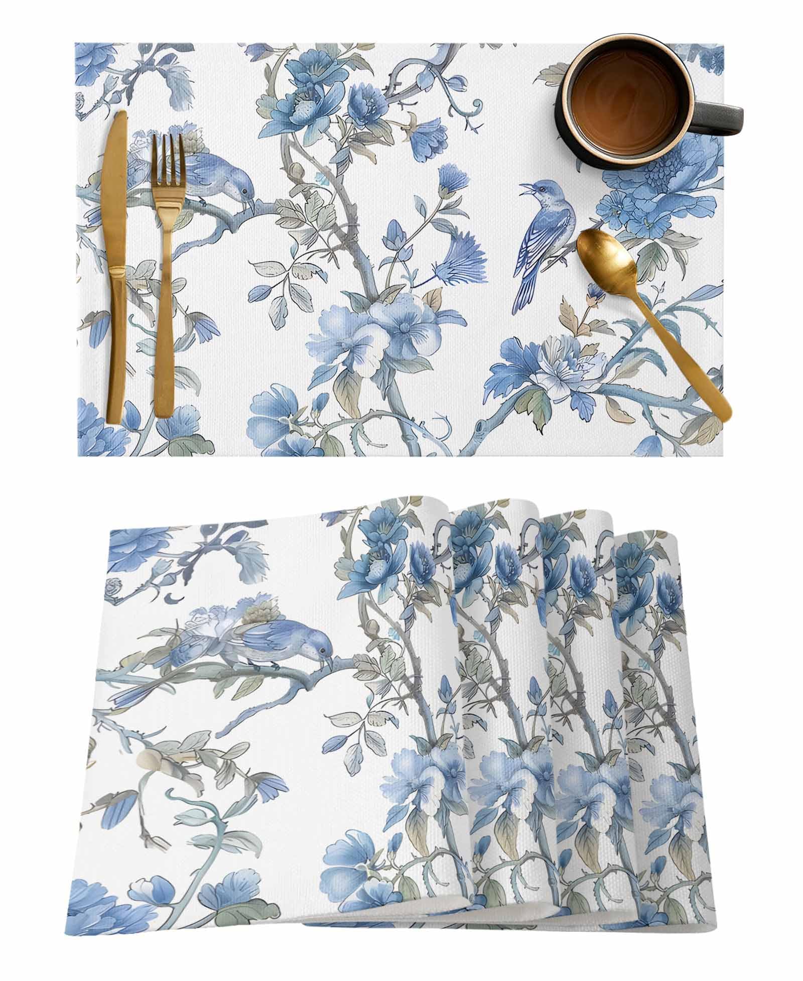 Ianokkcant Placemats Set of 12, Blue Spring Floral Woven Placemat, Linen Place Mats for Kitchen/Dining Tables, Birds Summer Flowers Botanical Indoor/|Kitchen & Dining
