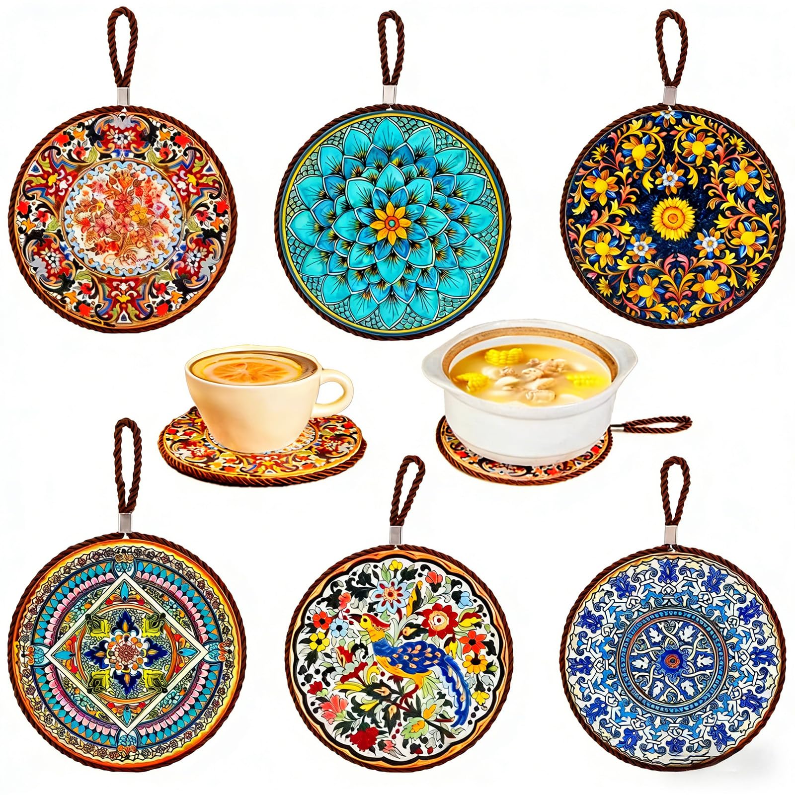 Round Trivets Set of 6 Ceramic Dining Table Kitchen Trivets with Cork Base Heat-Resistant and Non-Slip hot pan mat 6.7" Vintage Style can be Used for|Kitchen & Dining