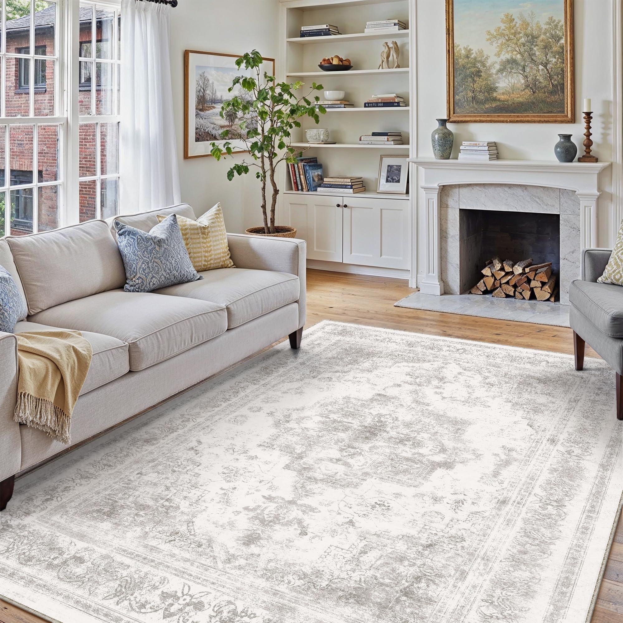 PureCozy Washable Rug 6x9 Area Rug for Living Room Light Gray Vintage Boho Medallion Large Grey Distressed Retro Carpet Non Slip Indoor Low Pile Small|Kitchen & Dining