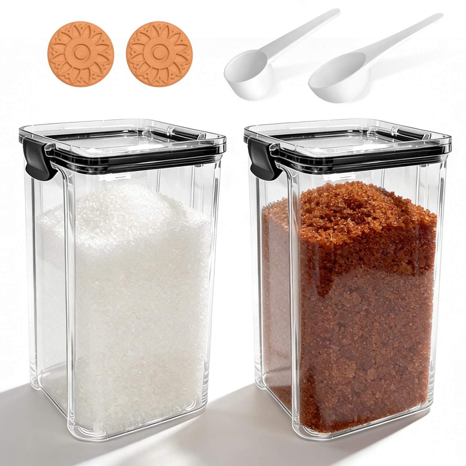 Obantrsz Brown Sugar Container (2-Pack), 44Oz/1300ml Airtight PET Storage Jar with Lid, Spoon & 2 Sugar Savers - Stackable Kitchen Canister for Baking|Kitchen & Dining