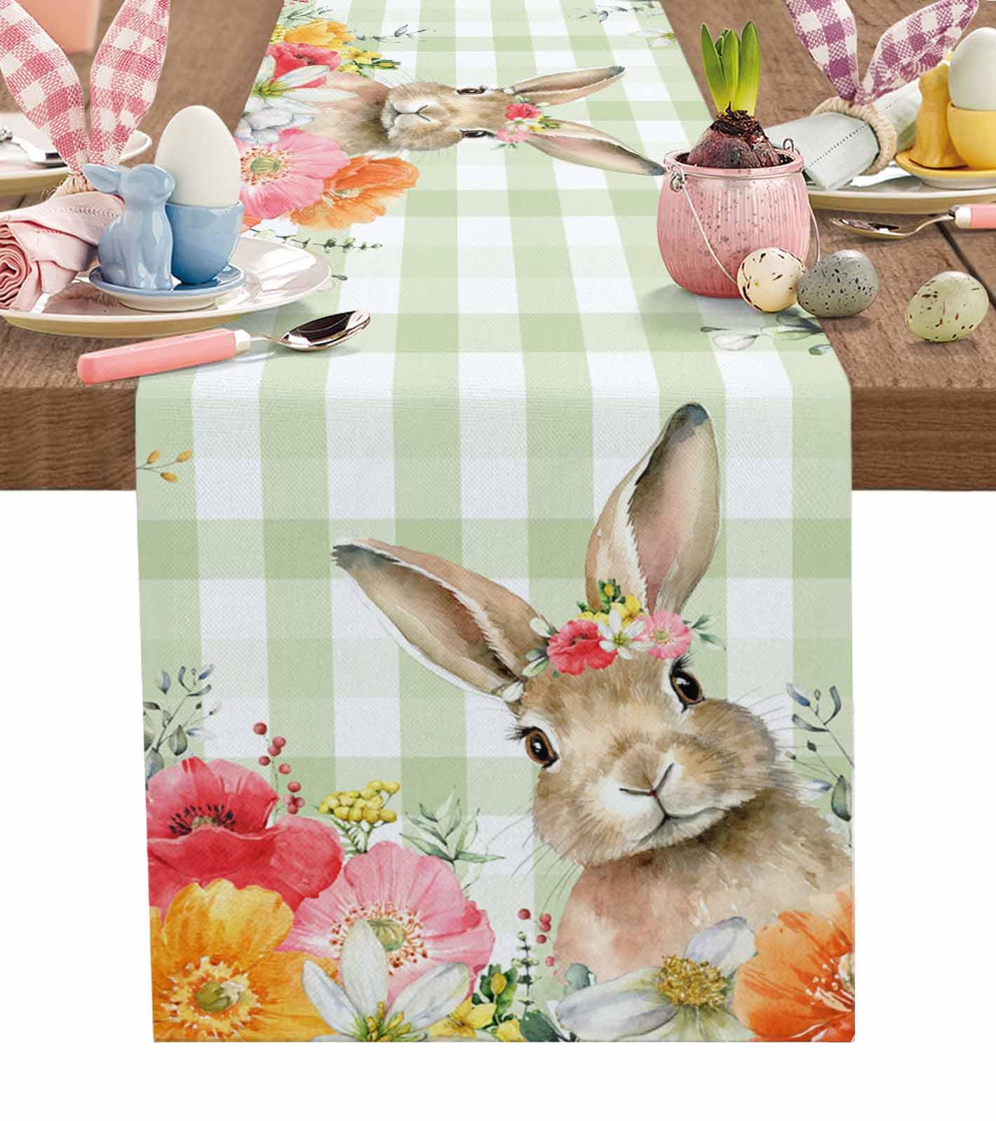Easter Table Runner 13x72 Inches Long Floral Bunny Table Runners Washable Cotton Linen Spring Rabbit Green Buffalo Plaid Dresser Scarf Kitchen Dining|Kitchen & Dining