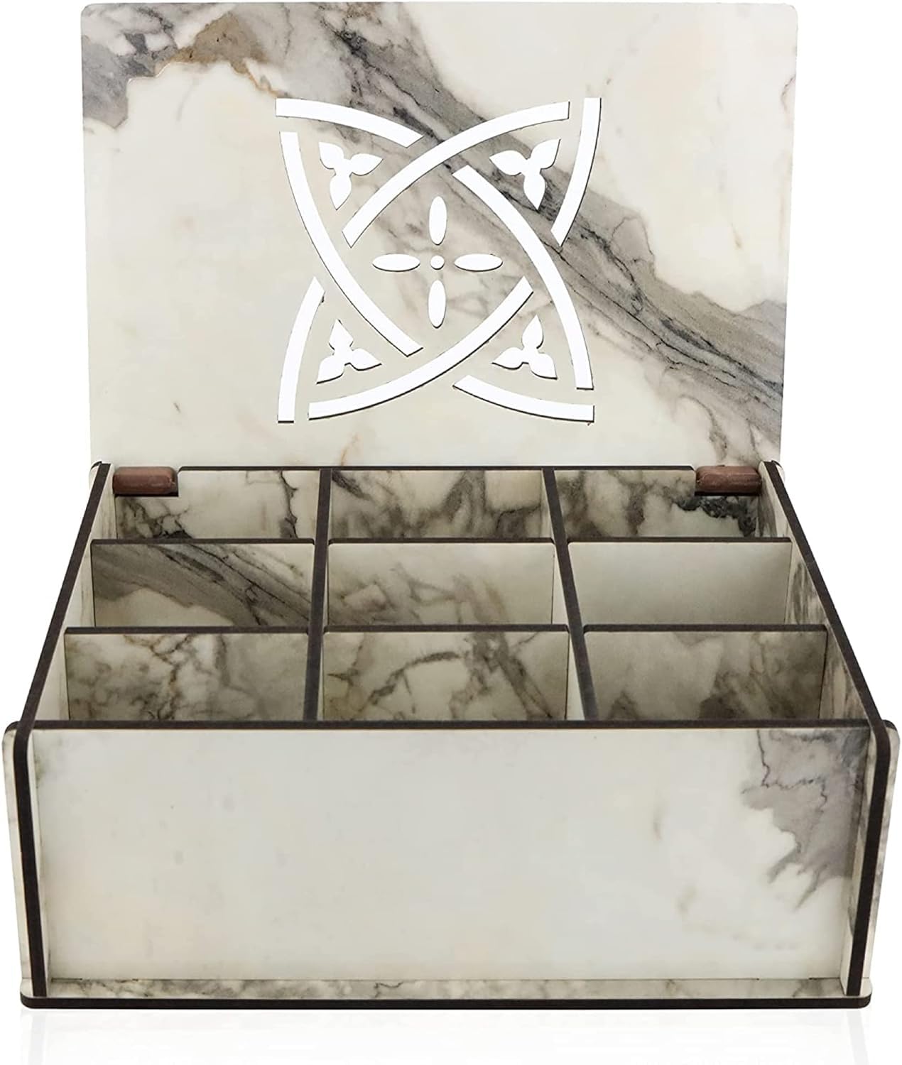 Eva's Gift Universe Tea Storage Box with 9 Compartments, Wood MDF Tea Bag Organizer, Decorative Storage Container (Marble)|Kitchen & Dining