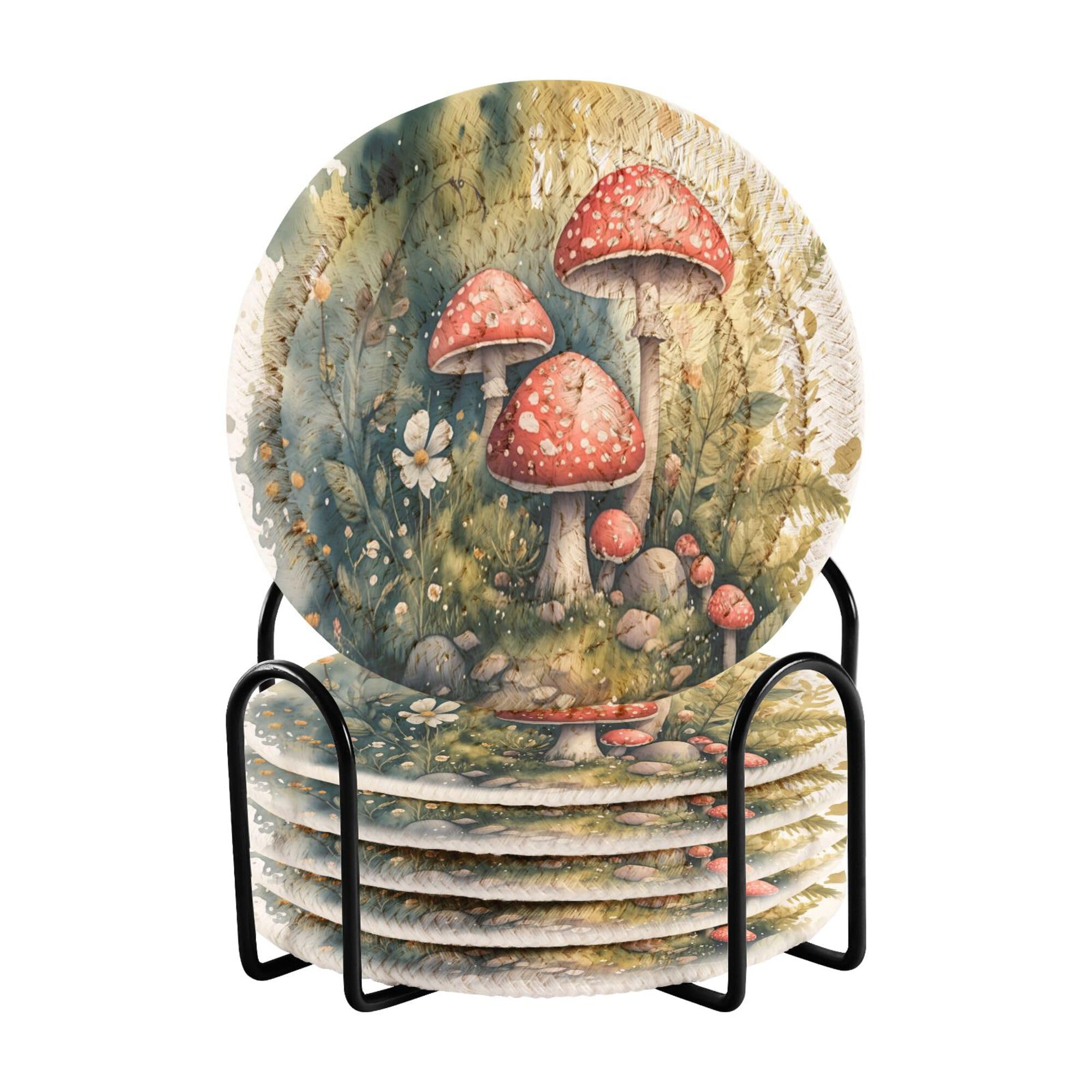 SEHANY Mushroom Forest Drink Coasters Set of 6 with Holder, Heat Resistant Cotton Woven Absorbent Round Coasters for Dining Table Coffee Mugs Cup|Kitchen & Dining