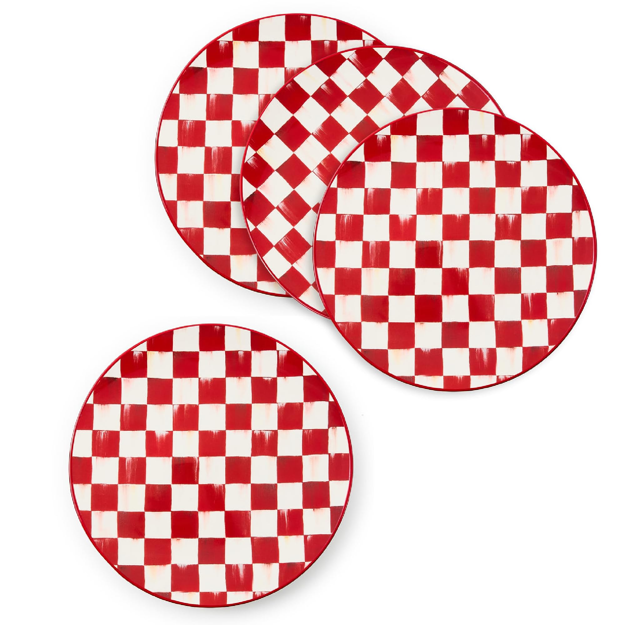 MACKENZIE-CHILDS Set of 4 Stoneware Dinner Plates, Dishwasher- and Microwave-Safe Plates, 10.5 Inches, Red-and-White Cherry Check|Kitchen & Dining