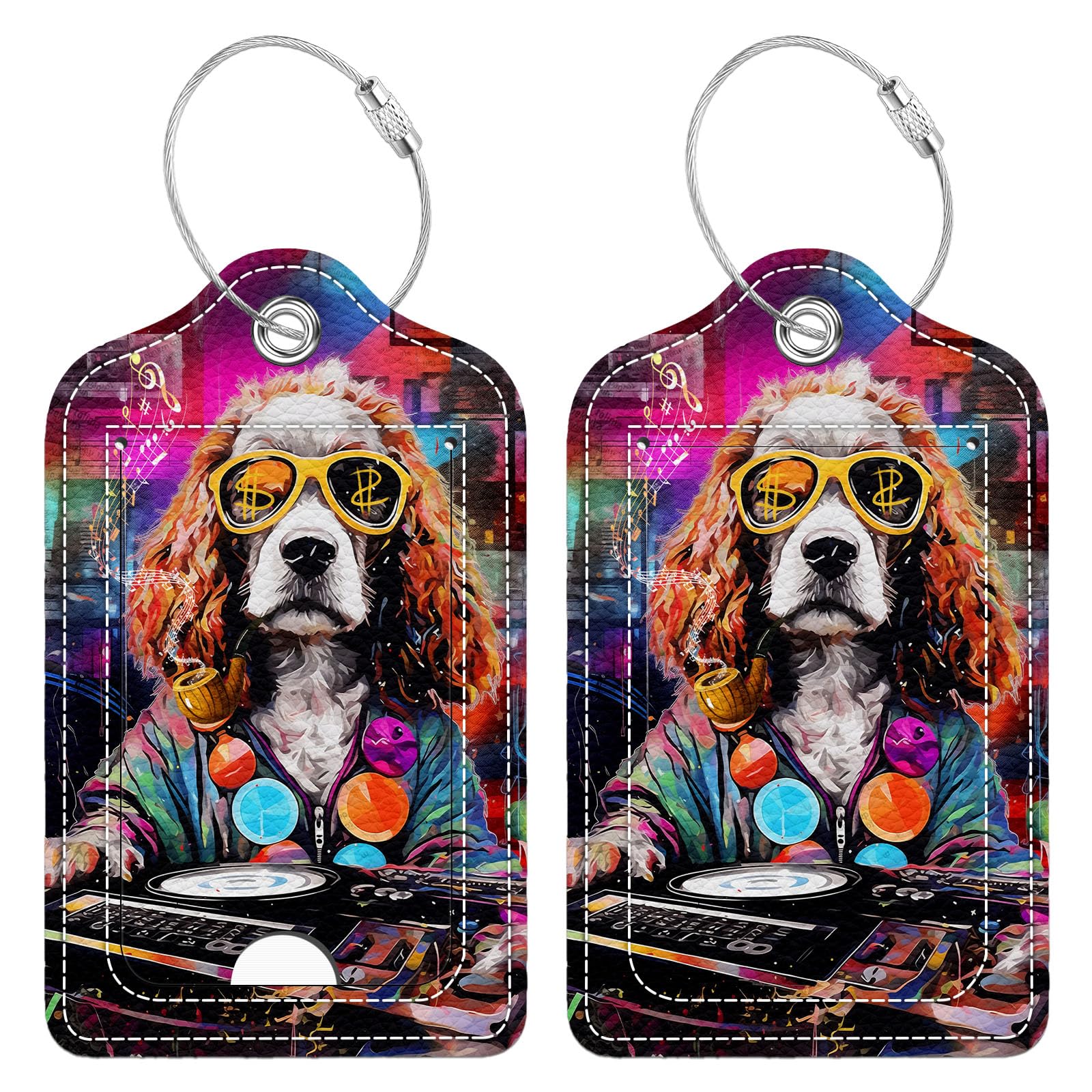 Bvkilrvc 2 Pcs Luggage Tag for Suitcase, Hip Hop Dog Wearing Glasses Unique Leather Suitcase Tags with Full Privacy Cover Stainless Steel Loop for|Luggage & Bags
