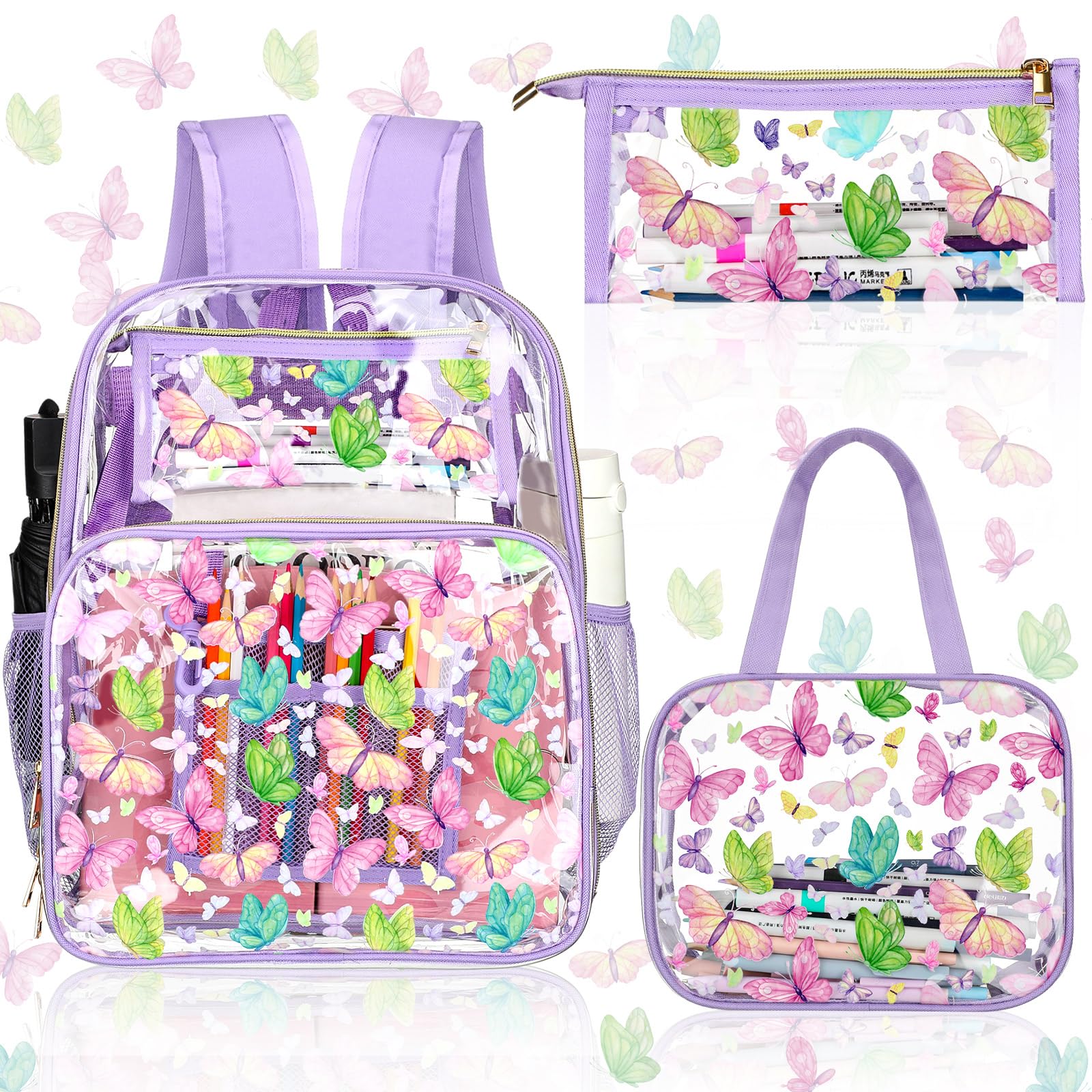 Kacctyen 3 Pcs Clear Backpack Heavy Duty Clear Bookbag Transparent Backpack with Lunch Bag(Purple, Butterfly)|Luggage & Bags