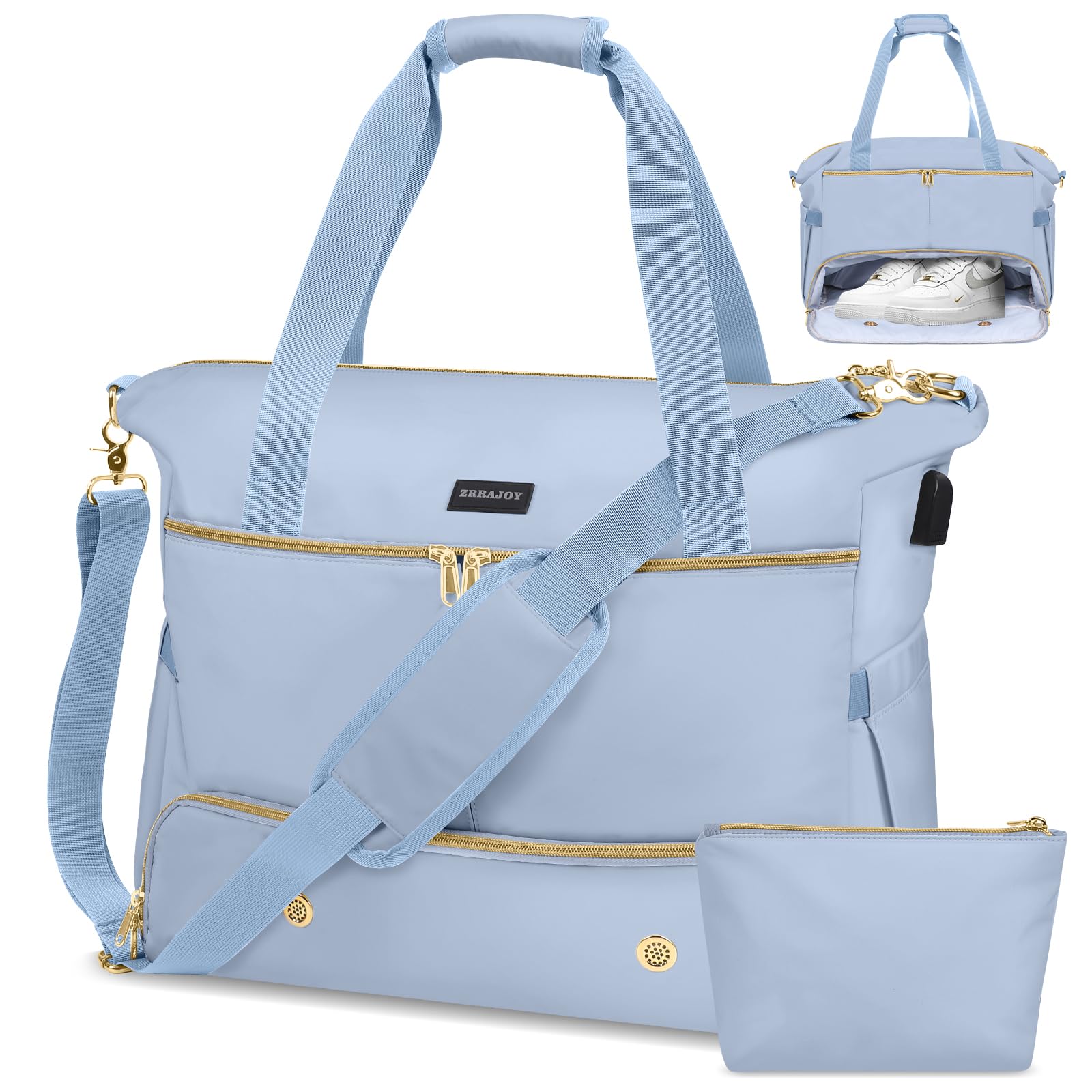 ZRRAJOY Weekender Overnight Bag for Women, Large Travel Duffel with Shoe Compartment, Wet Pocket, USB Charging Port, Carry-On Gym Tote Bag (Blue)|Luggage & Bags