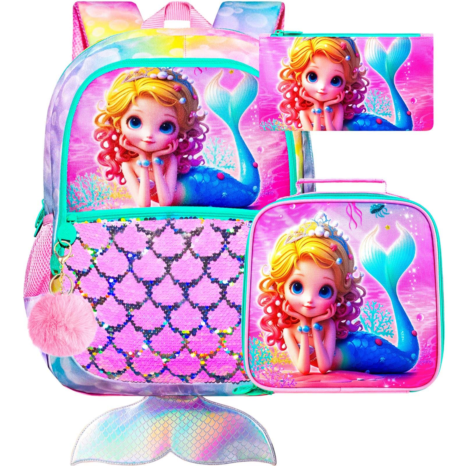ZLYERT 3Pcs Mermaid Backpack for Girls, 16" Sequins Kids Bookbag with Lunch Box, School Backpacks Set for Elementary Preschool Kindergarten(Pink)|Luggage & Bags