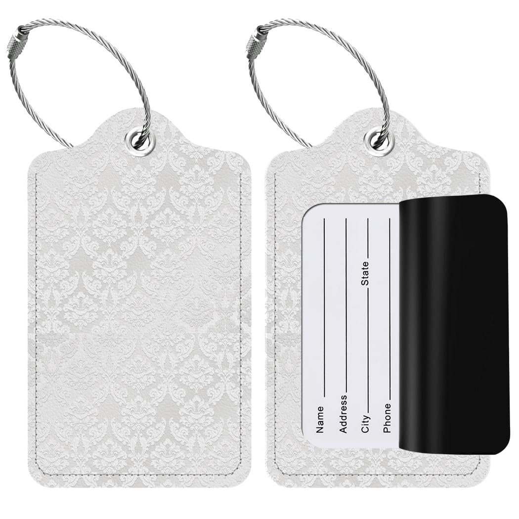 Pack of 2, Vegan Leather Luggage Tags (White Damask Vintage Pattern) Suitcase ID Tags with Privacy Cover for Baggage, Backpack, Travel Bag, Kids,|Luggage & Bags