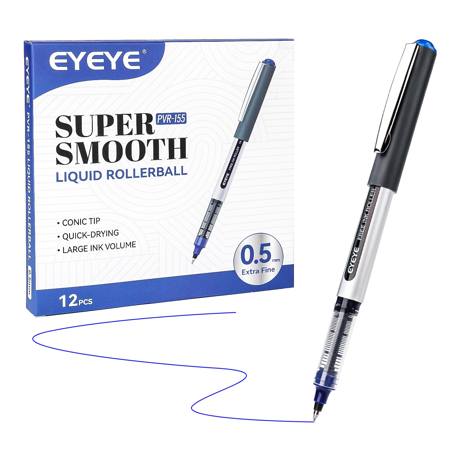 EYEYE Blue Rollerball Pens 0.5mm, 12 Pack Liquid Ink Roller Ball Pen Extra Fine Point Quick Dry, Blue Ink Pens Fine Point Smooth Writing Pen for|Office Supplies