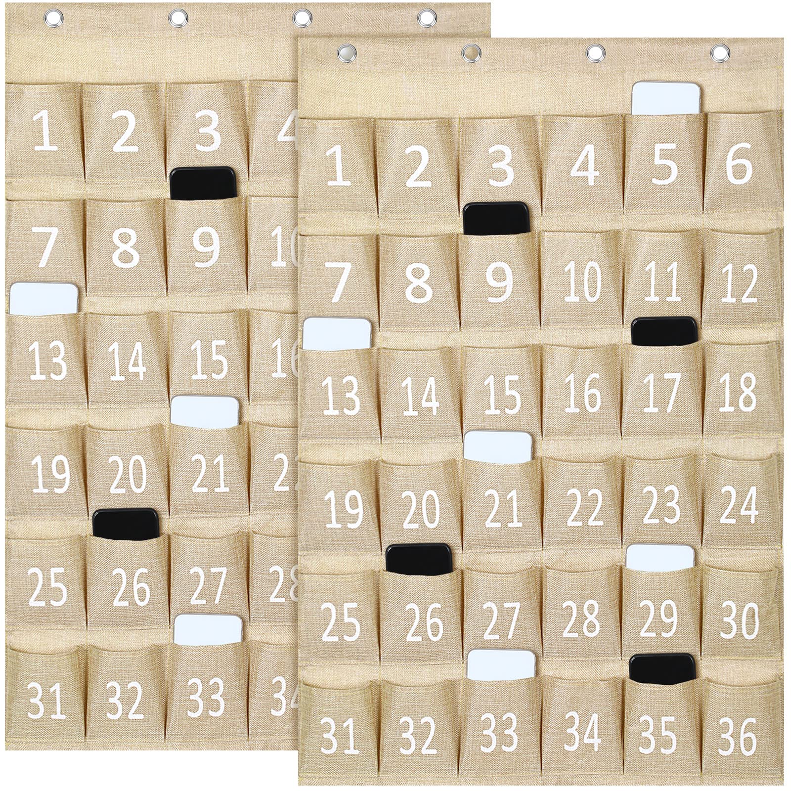 Berlune 2 Pcs Numbered Pocket Chart Burlap Cell Phone Holder Farmhouse Burlap Calculator Holder with 36 Number Sticker Hanging Pocket Organizer for|Office Supplies