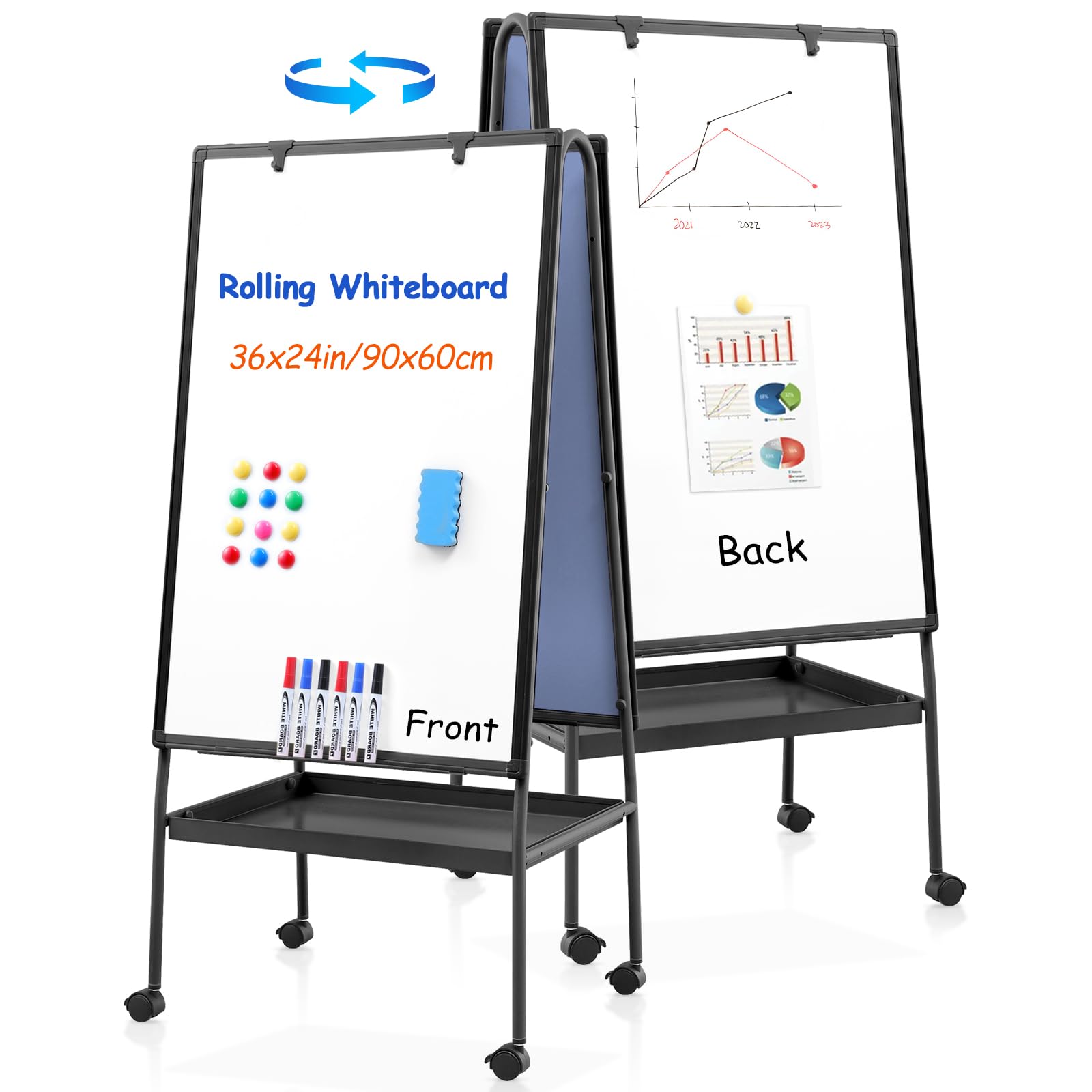 MAKELLO Rolling Whiteboard on Wheels 36x24 in, Double Sided Mobile White Board with Storage Tray for Office School Home, Magnetic Classroom Easel for|Office Supplies