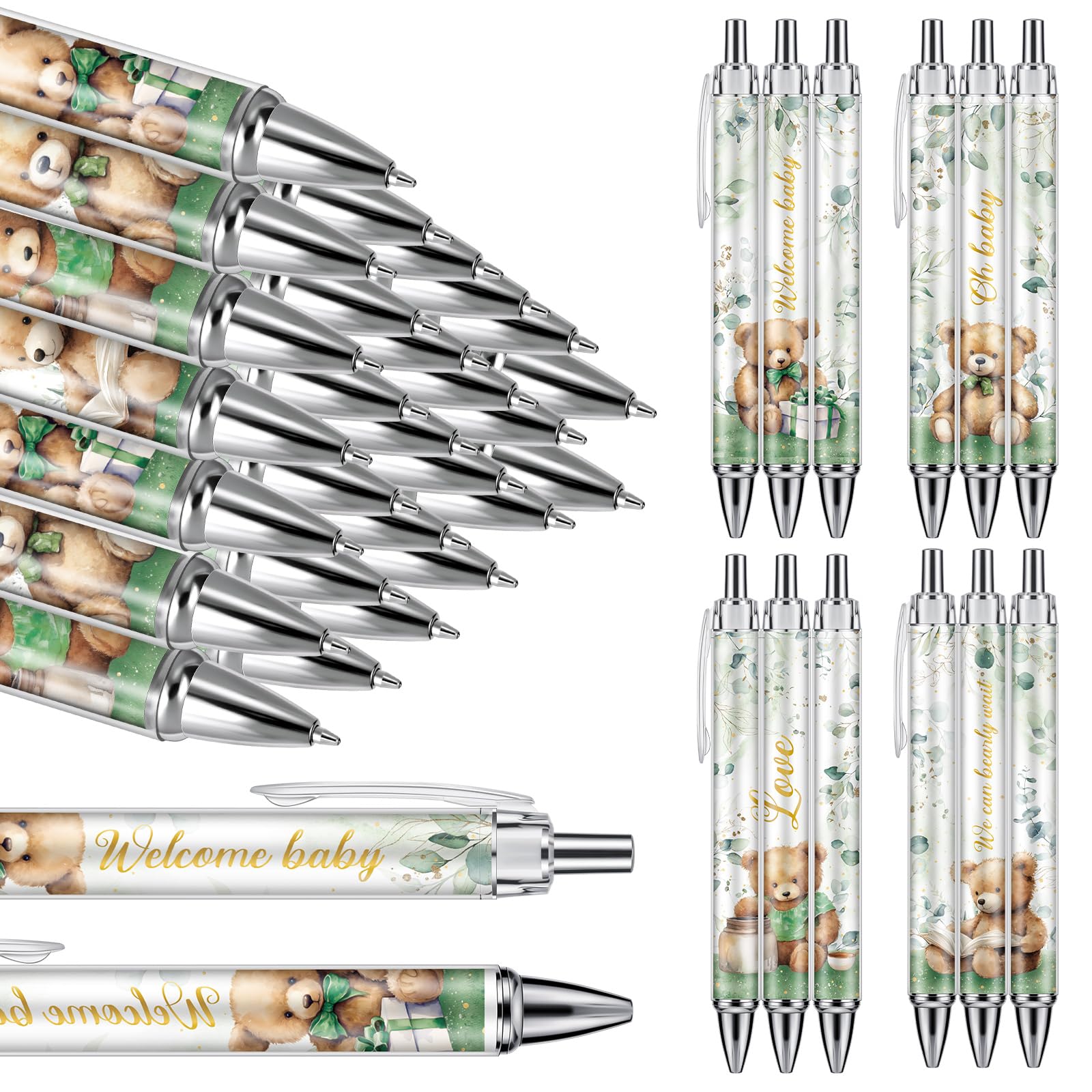 Chuangdi 24 Pcs Green Bear Baby Shower Ballpoint Pens Favors Bulk Retractable Ballpoint Pen Black Ink with Gifts for Guests School Supply|Office Supplies