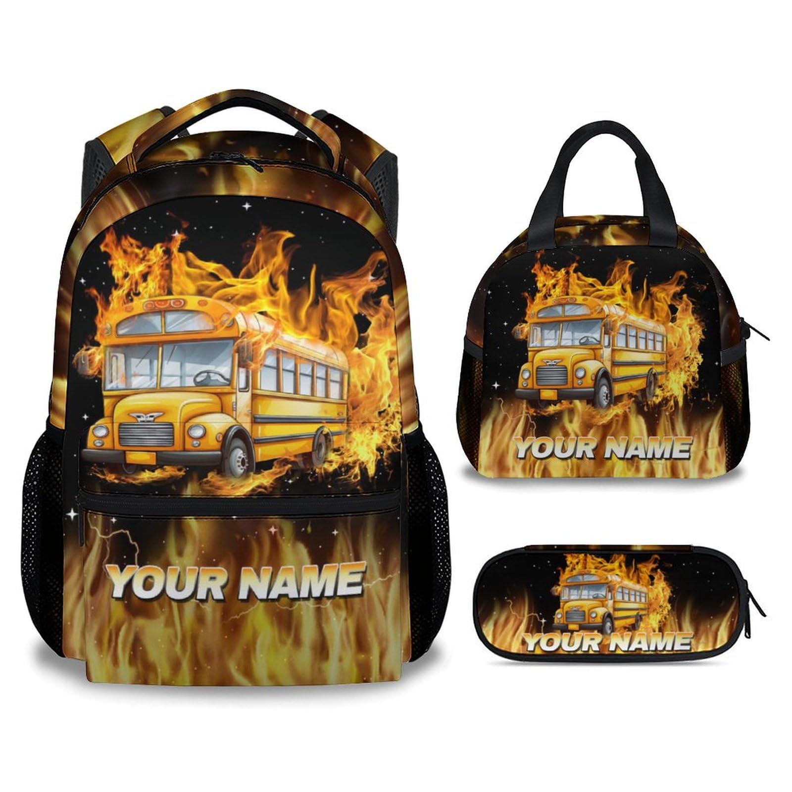 BEOIIBIRD Custom Backpack with Lunch Box and Pencil Case Set, 3 in 1 School Bus Backpacks Matching Combo, Cute Boys Bookbag and Pencil Case Bundle|Office Supplies
