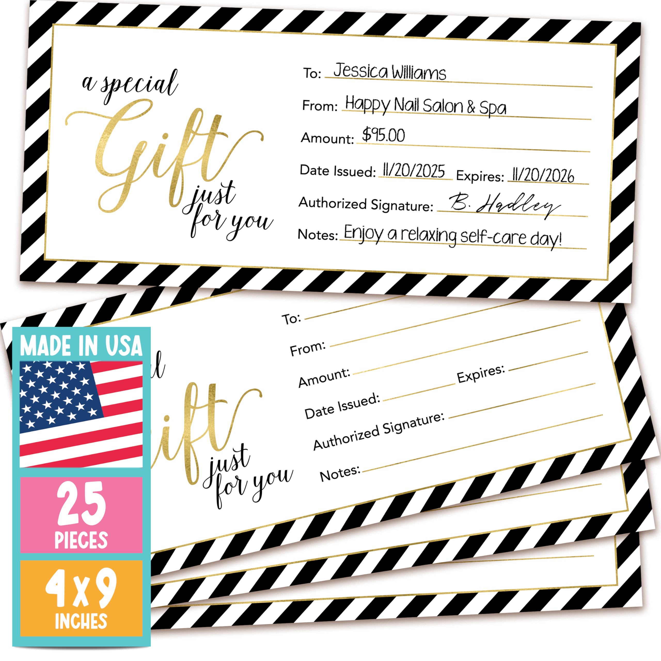 Hadley Designs 25 Blank Gift Certificates for Business – 4x9 Christmas Gift Certificates Cards for Small Business, Spa, Massage, Nail & Hair Salon,|Office Supplies