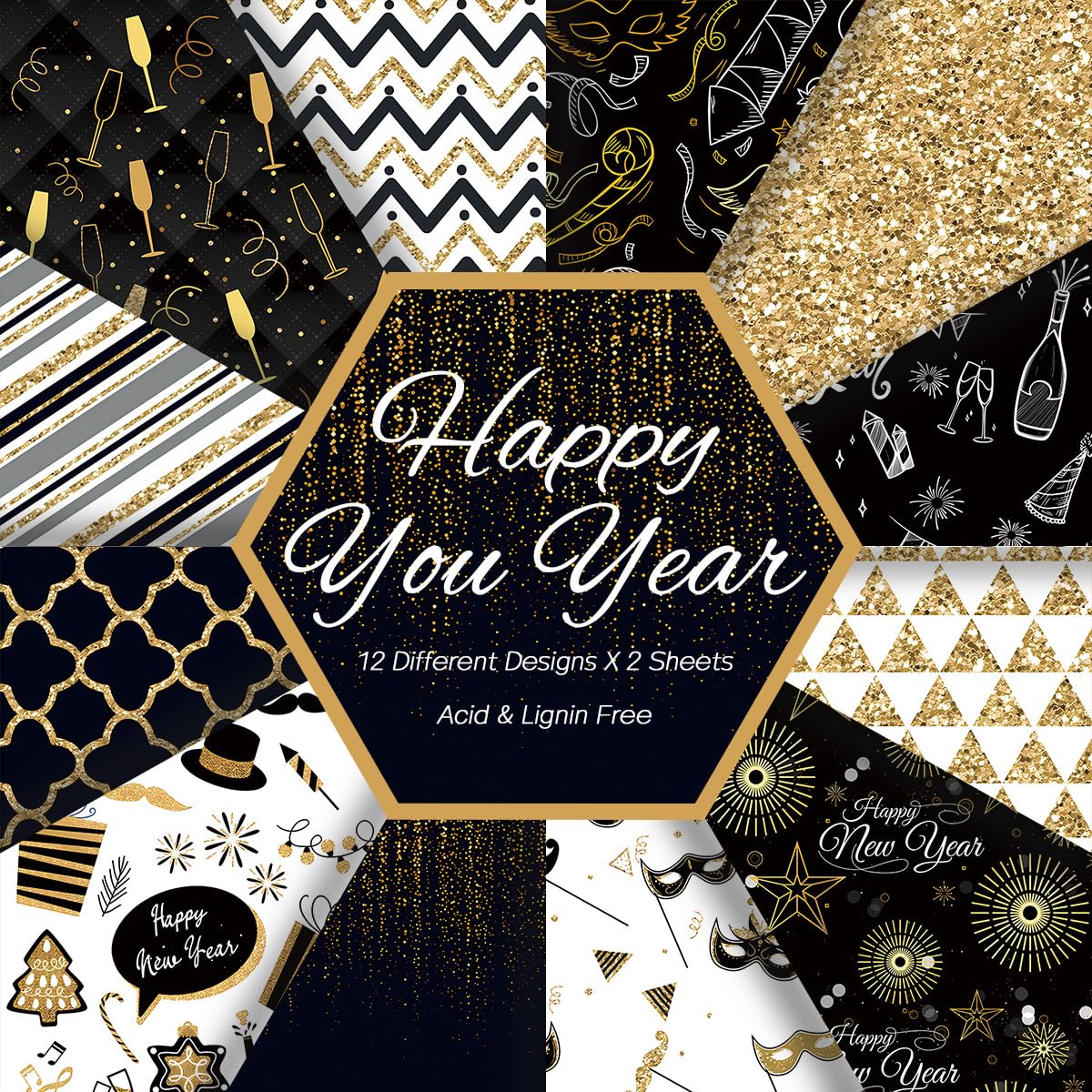 GLKTOPO 24 Sheets Festival Celebration Scrapbook Paper Black Gold Patterned 6 Inches Single-Sided Square Craft Paper Happy New Year Decor Origami|Office Supplies
