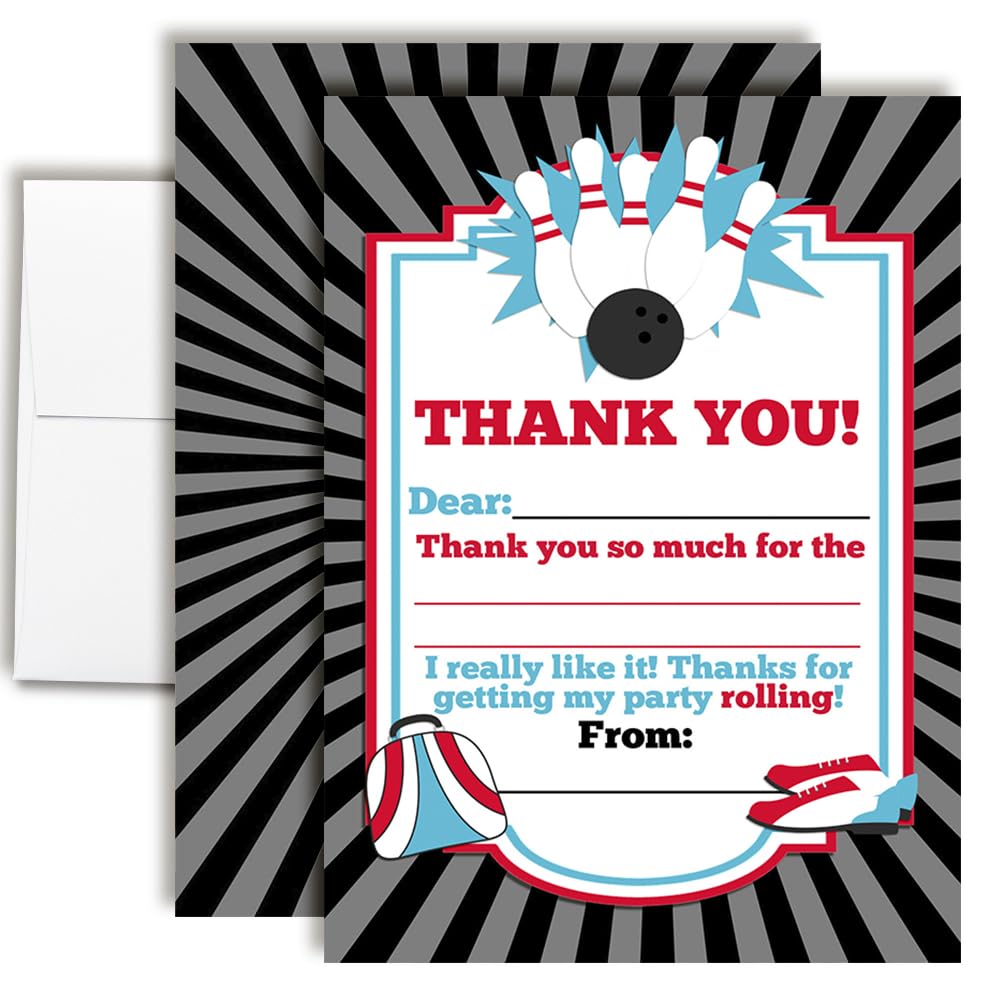 Bowling Thank You Notes for Kids, Ten 4" x 5.5" Fill In The Blank Cards with 10 White Envelopes by AmandaCreation|Office Supplies