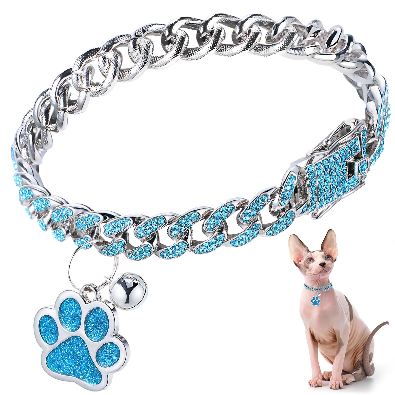 Hillban Cat Collar Diamond Chain Glitter Collar Walking Metal with Secure Buckle Cat Pet Necklace with Paw Charm and ID Tag Bell Link Cuban Jewelry|Pet Supplies