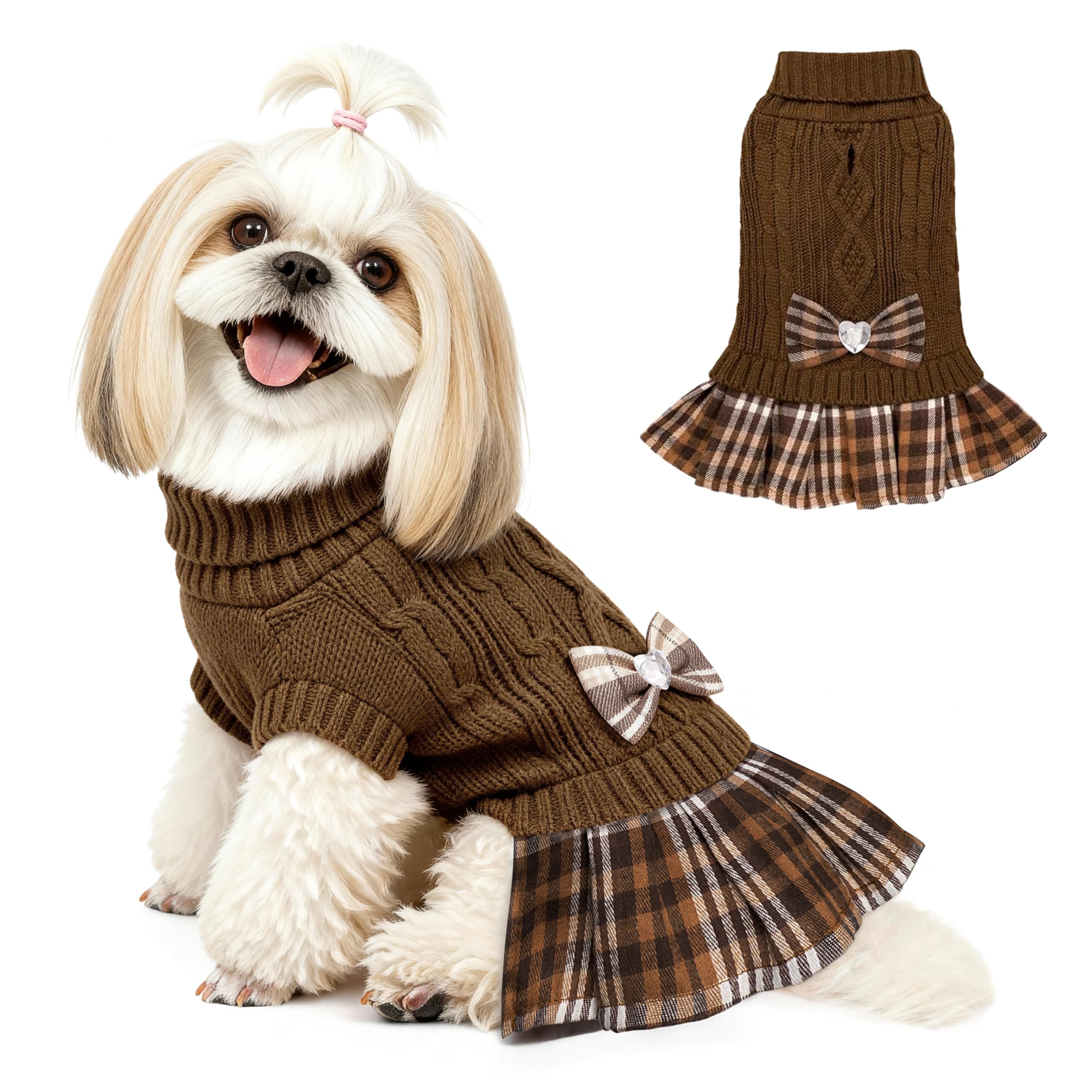 YUDODO Small Dog Sweater Dress with Bowtie Turtleneck - Knitted Pet Girl Dog Winter Clothes - Pet Warm Sweater for Puppy Yorkies, Chihuahua (M Brown)|Pet Supplies